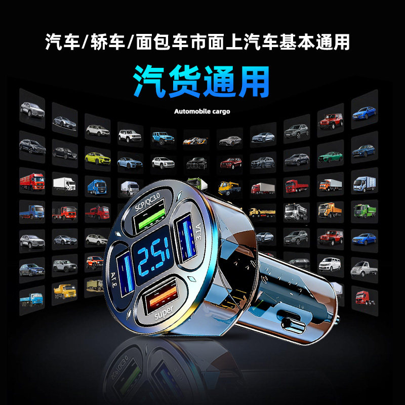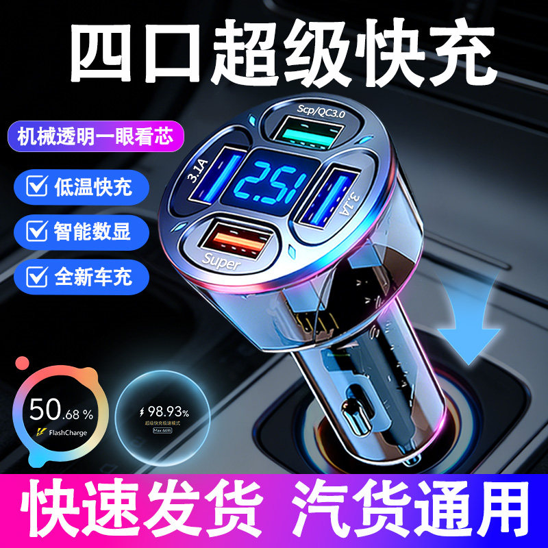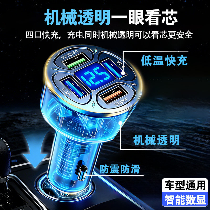 透明车载充电器多功能智能数显手机超级快充一拖四转换头车充usb