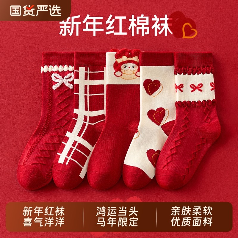 女童袜子棉质本命年红色棉袜女孩马年新年大红袜冬款中筒加厚童袜