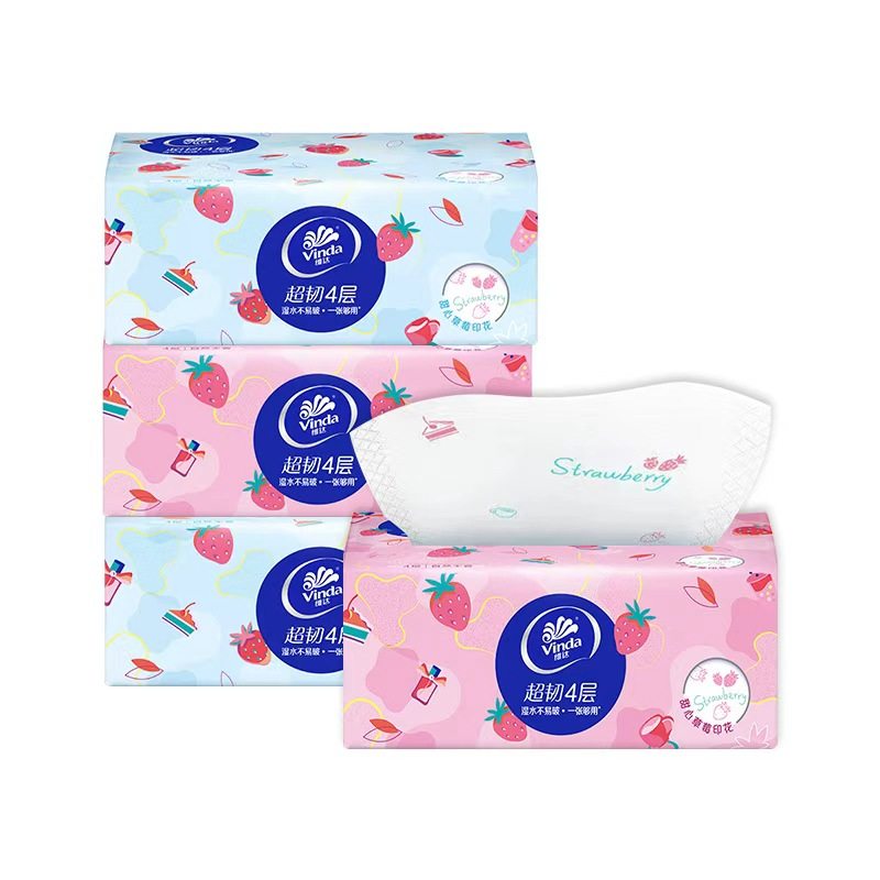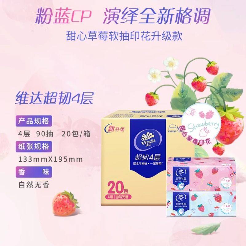 维达超韧抽纸草莓印花2包4层90抽加厚家用面巾纸母婴亲肤干湿纸巾