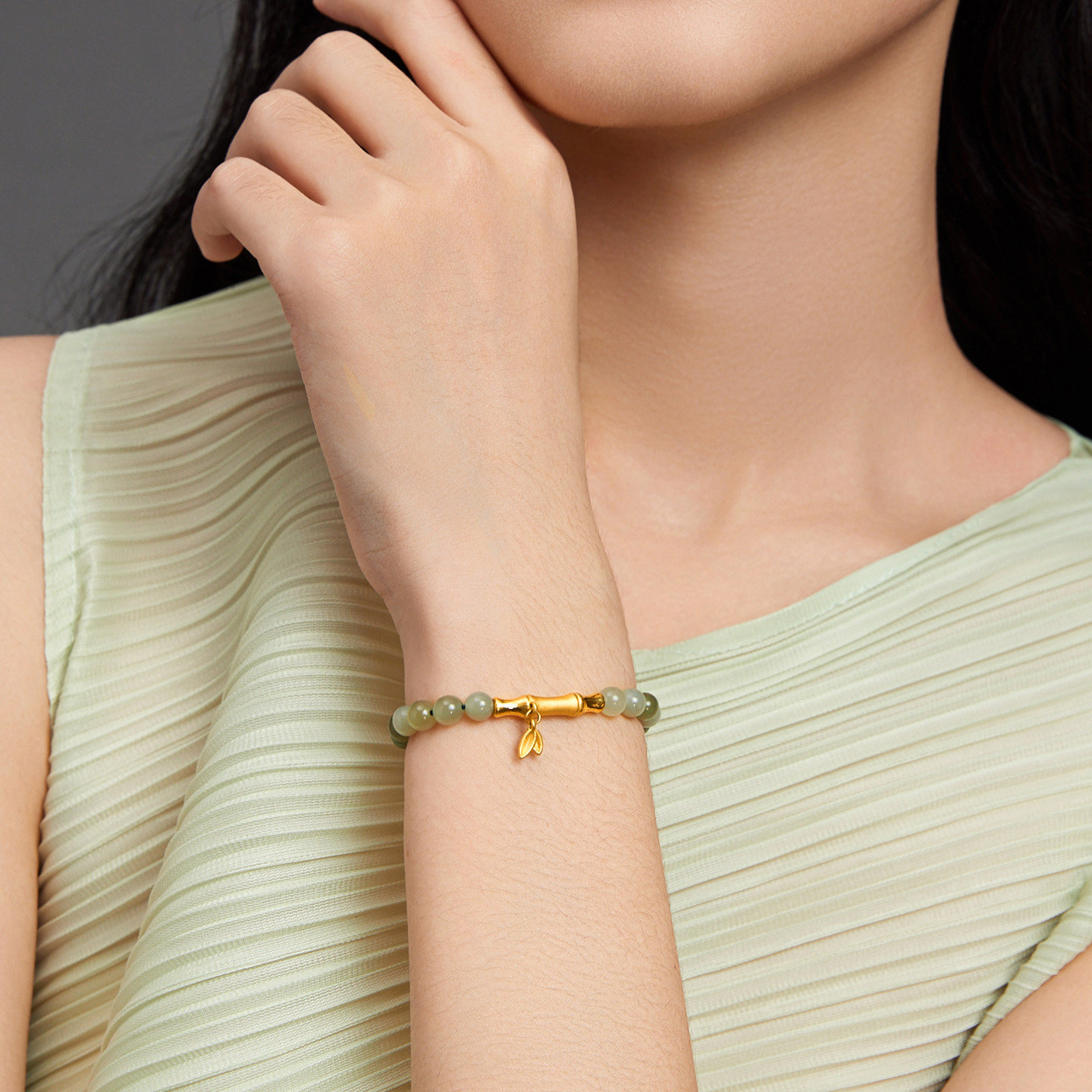 周六福黄金金镶玉手串节节高升竹节女手链和田玉串珠新年礼物