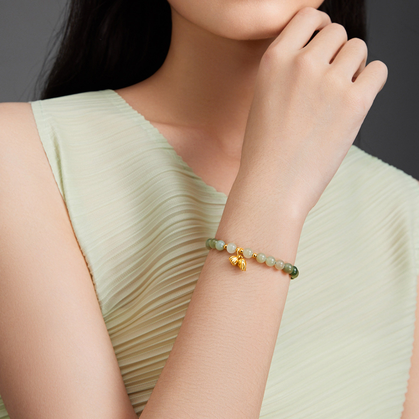 潮宏基倾玉足金翡翠和田玉檀木手链黄金手串一款两戴纪念礼物