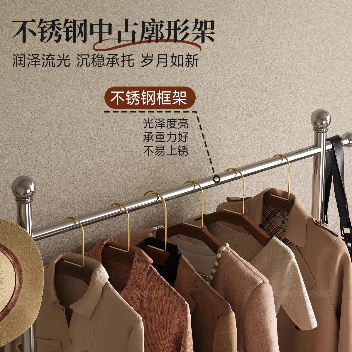 中古风衣帽架落地卧室家用挂衣架不锈钢挂衣杆衣架收纳固定衣物