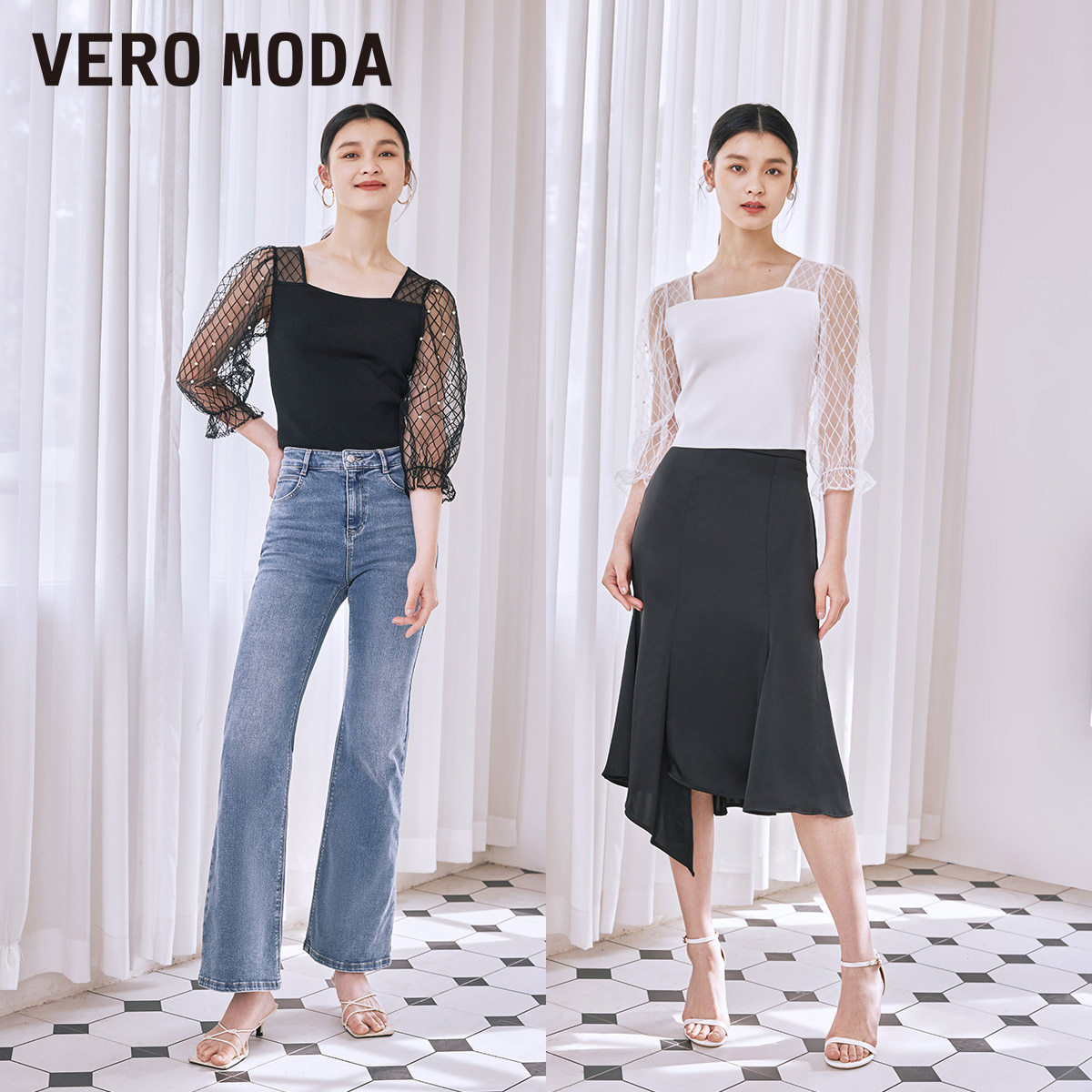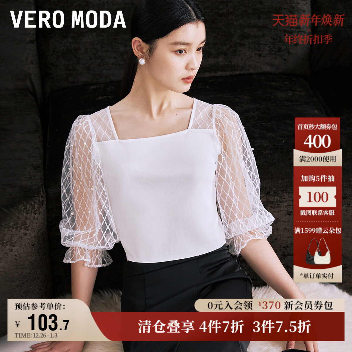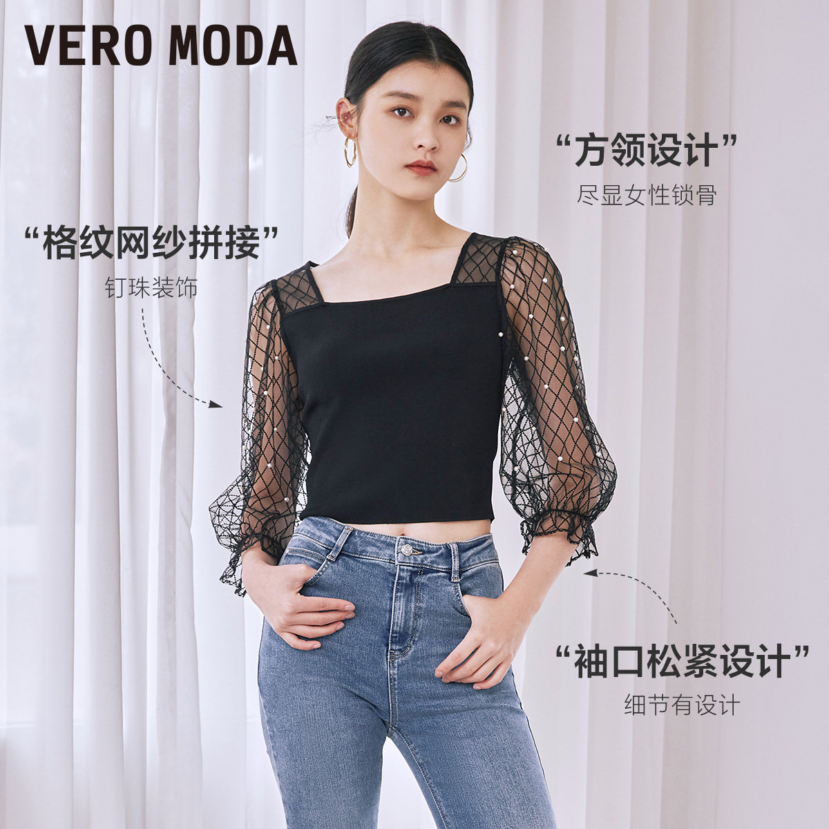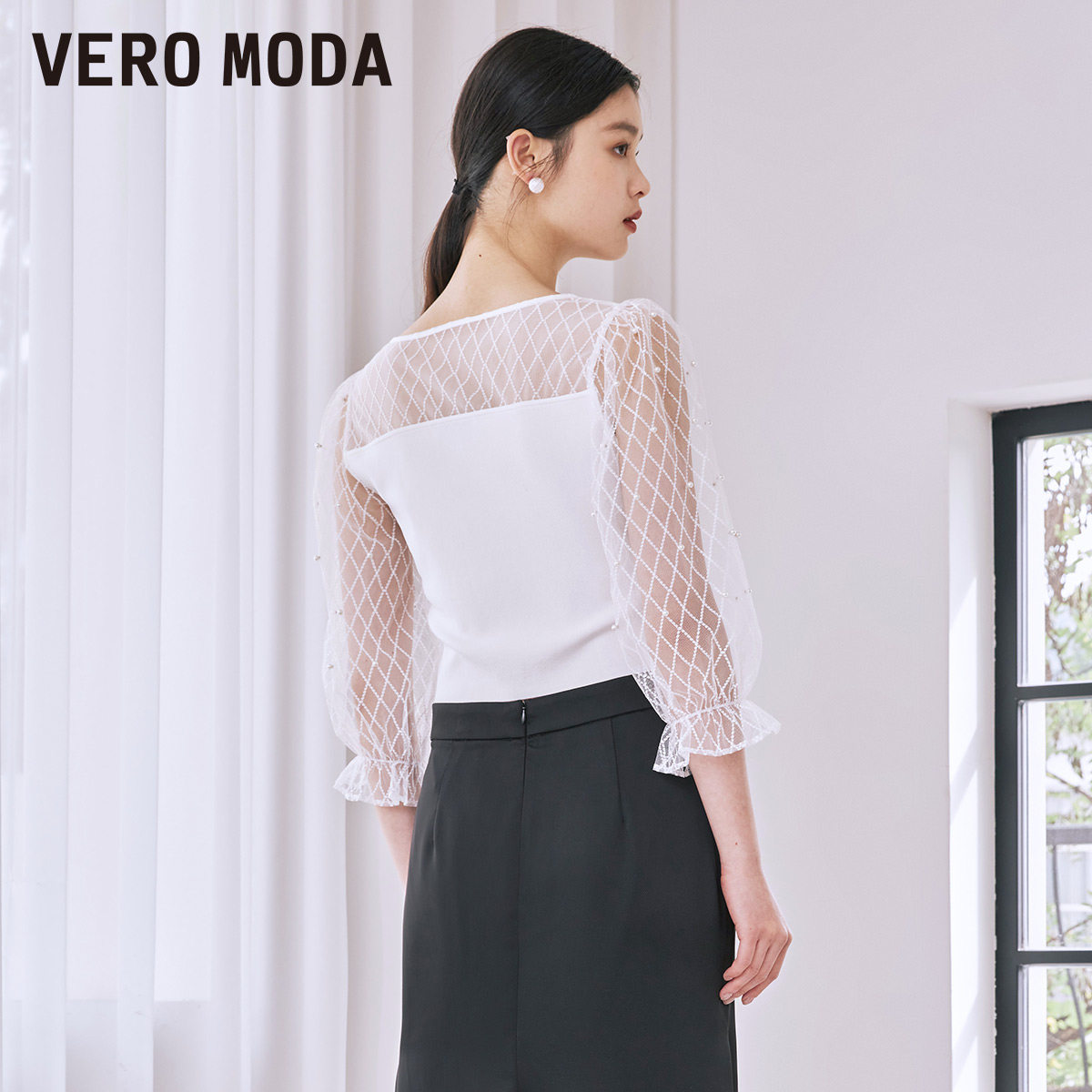 Vero Moda奥莱上衣秋冬清仓方领格纹网纱拼接气质修身针织衫女