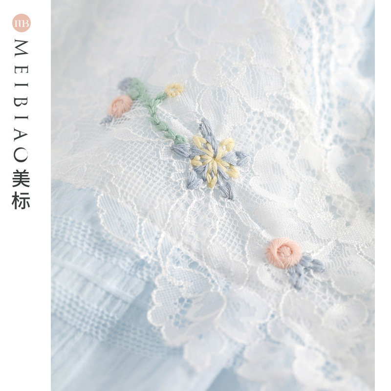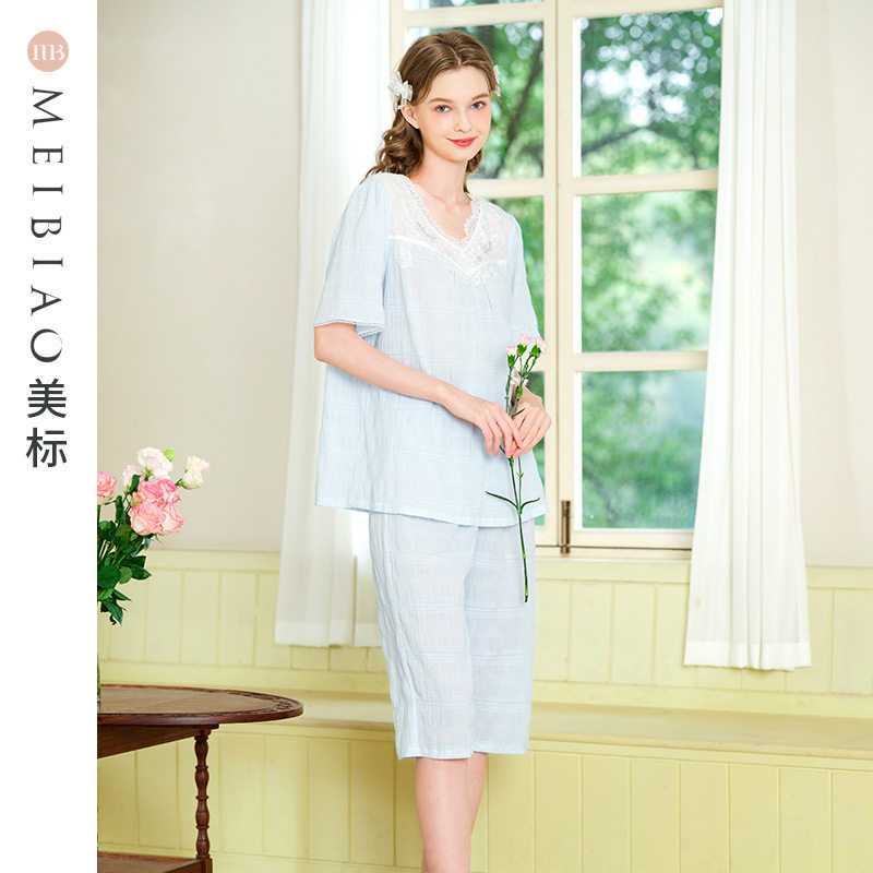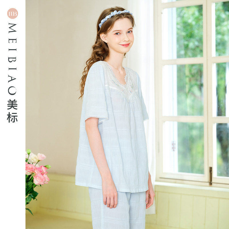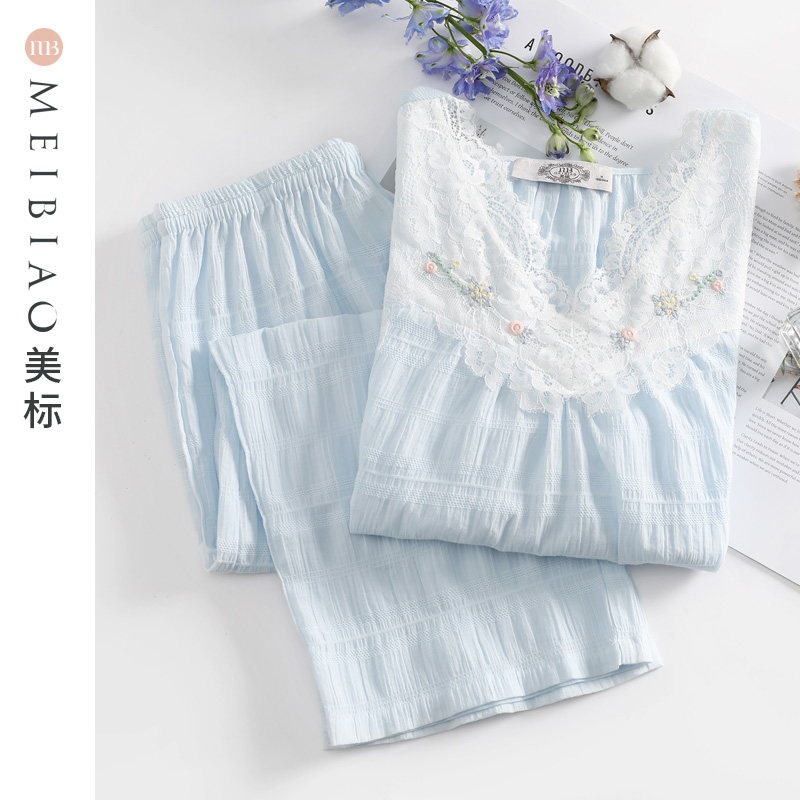 美标短袖纯棉睡衣套装女春夏薄款可外穿复古宫廷风蕾丝全棉家居服