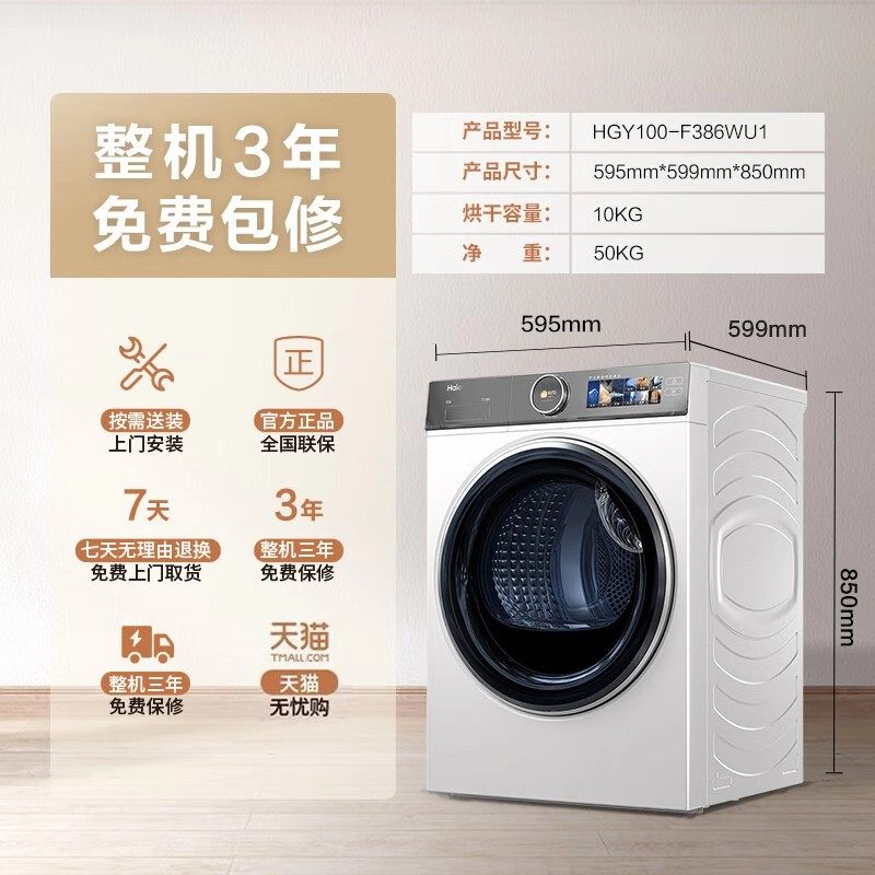 【云溪2.0精英版】海尔386W烘干衣机双擎热泵10kg全自动滚筒白
