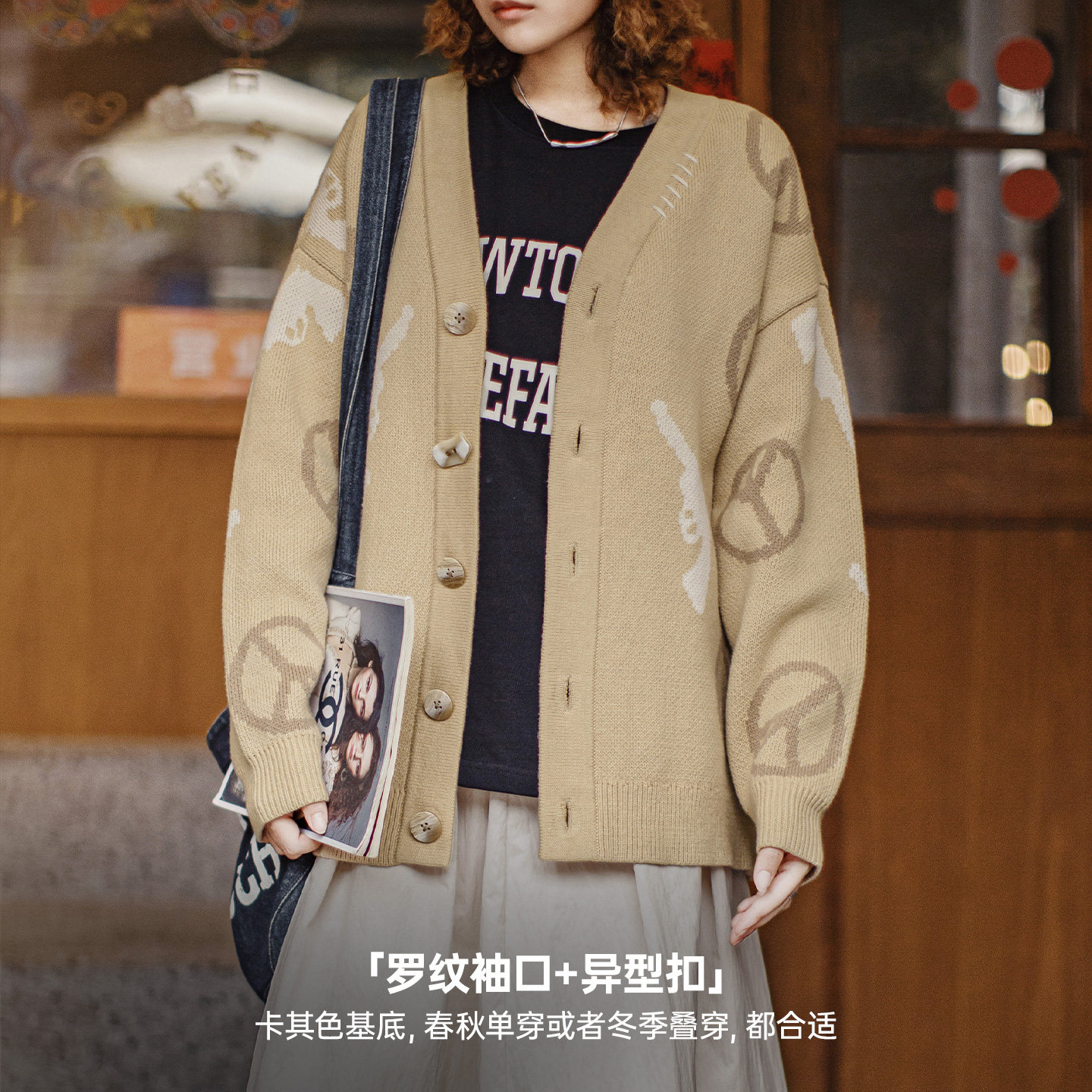 马登复古卡其色大V领宽松外穿毛衣提花针织开衫外套上衣女士秋冬