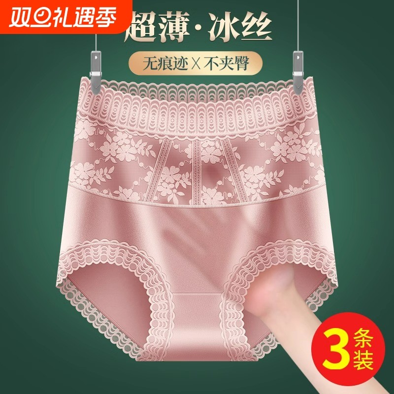 抗菌中高腰蕾丝内裤女纯棉夏季裆透明提臀收腹冰丝无痕三角裤