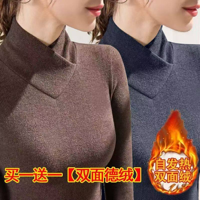 单/两件2025秋冬季新款半高V领女装加绒打底衫内搭时尚体恤D双面