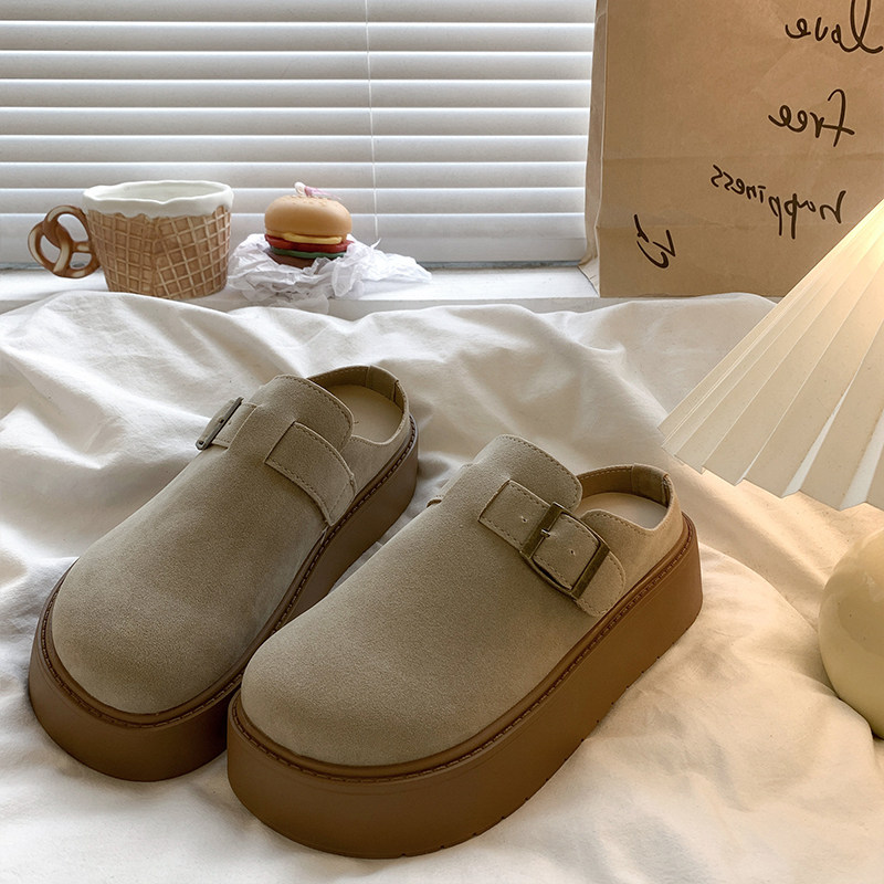 内增高6cm~厚底真皮勃肯鞋女2025秋冬新款真皮包头半拖鞋女外穿