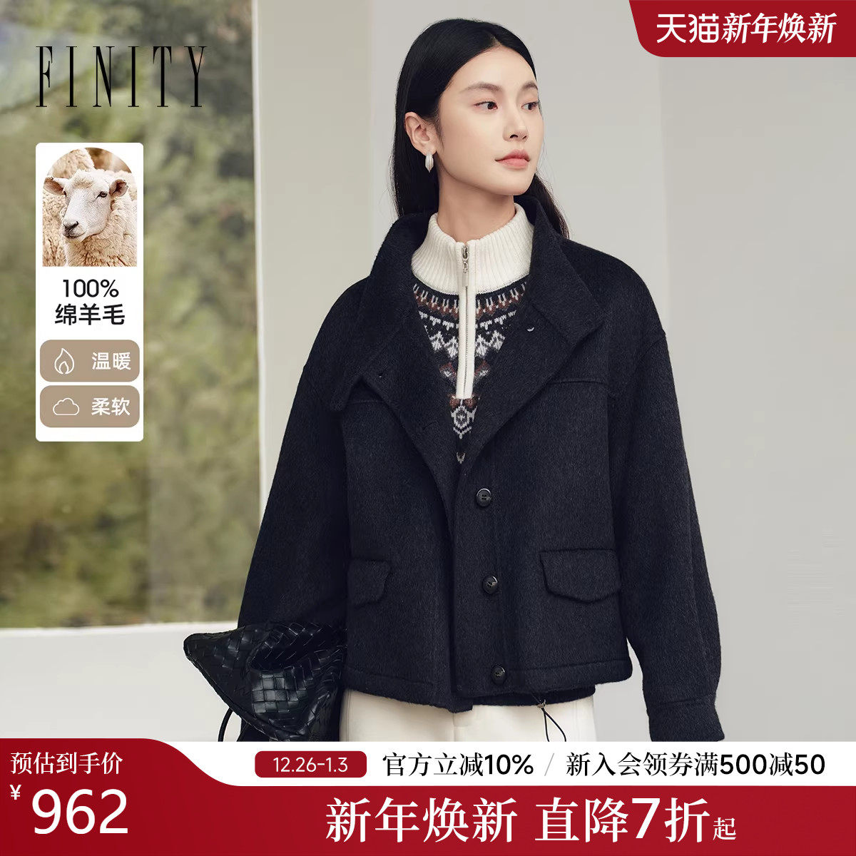 FINITY菲妮迪毛呢外套2025年冬季新款简约纯羊毛双面呢黑色大衣女