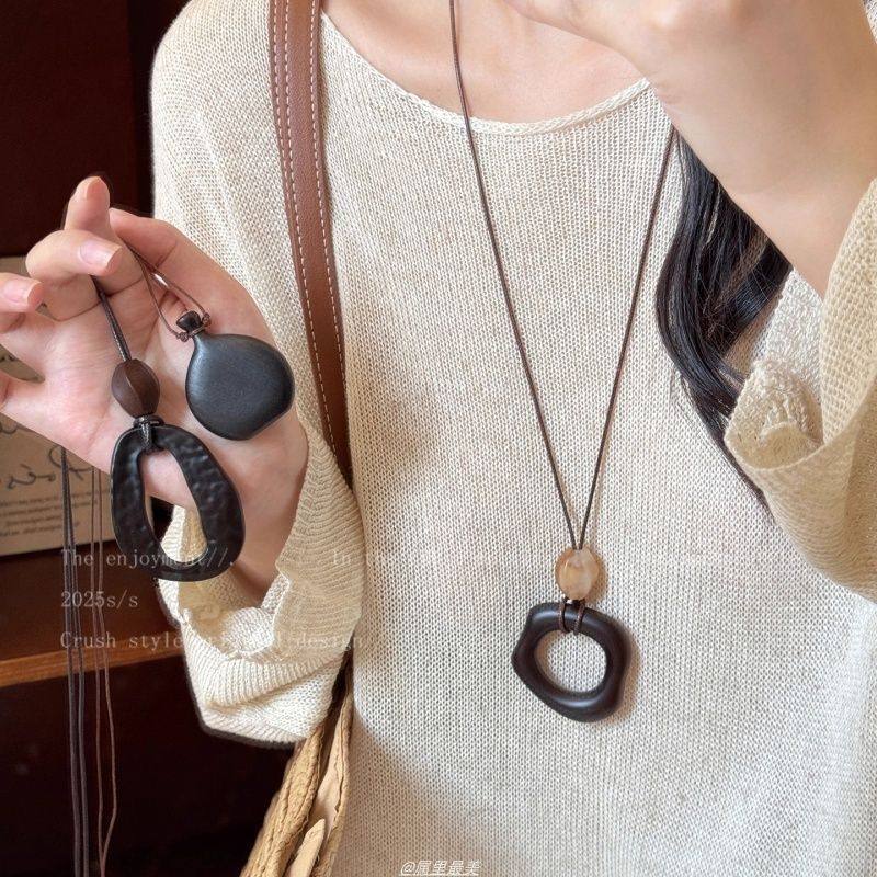 新中式镂空木质圆形吊坠项链女民族风小众设计毛衣链复古挂脖配饰