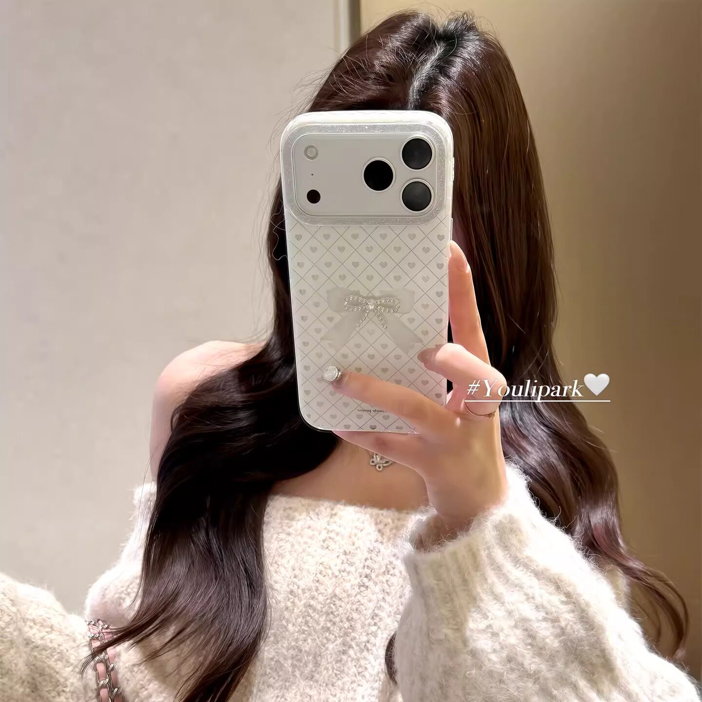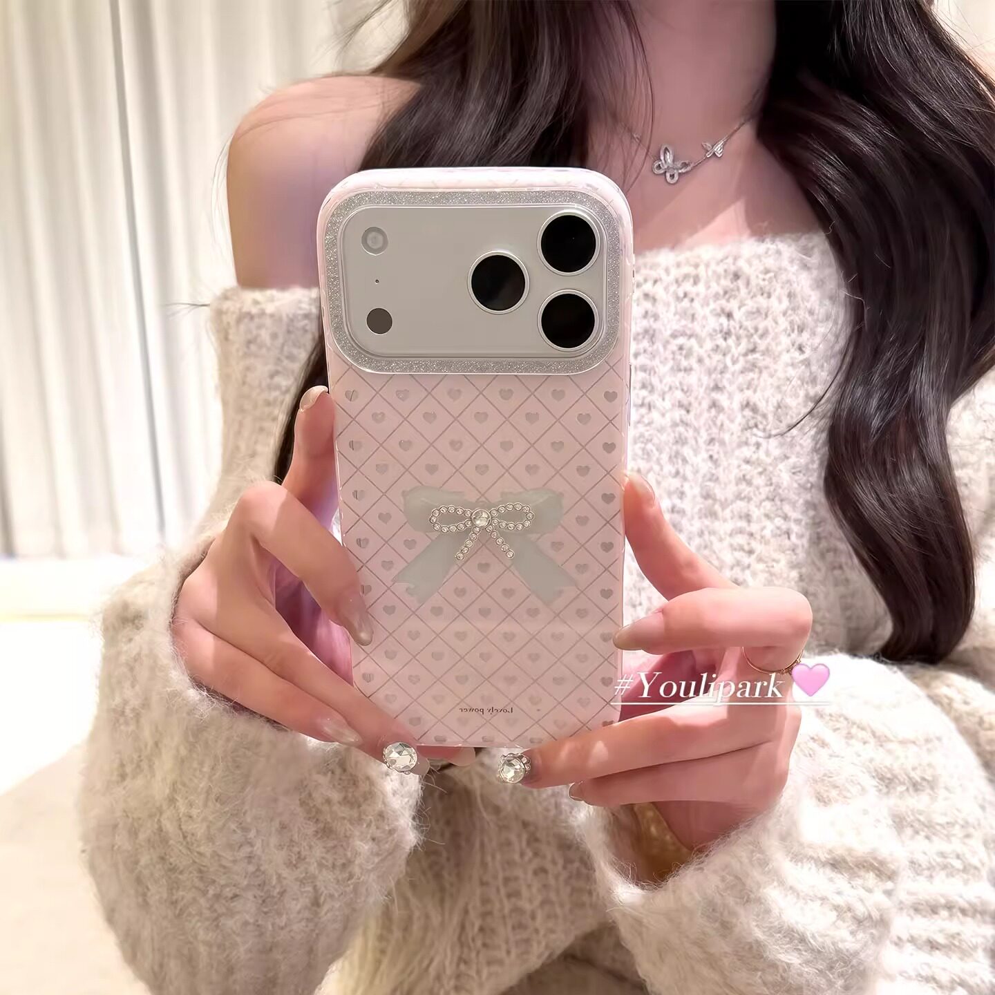 由里公园ins少女甜美高级感闪粉水钻蝴蝶结17适用17pro苹果17ProMax手机壳iPhone16全包14新款16Promax保护套