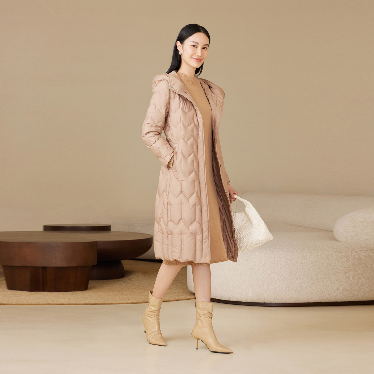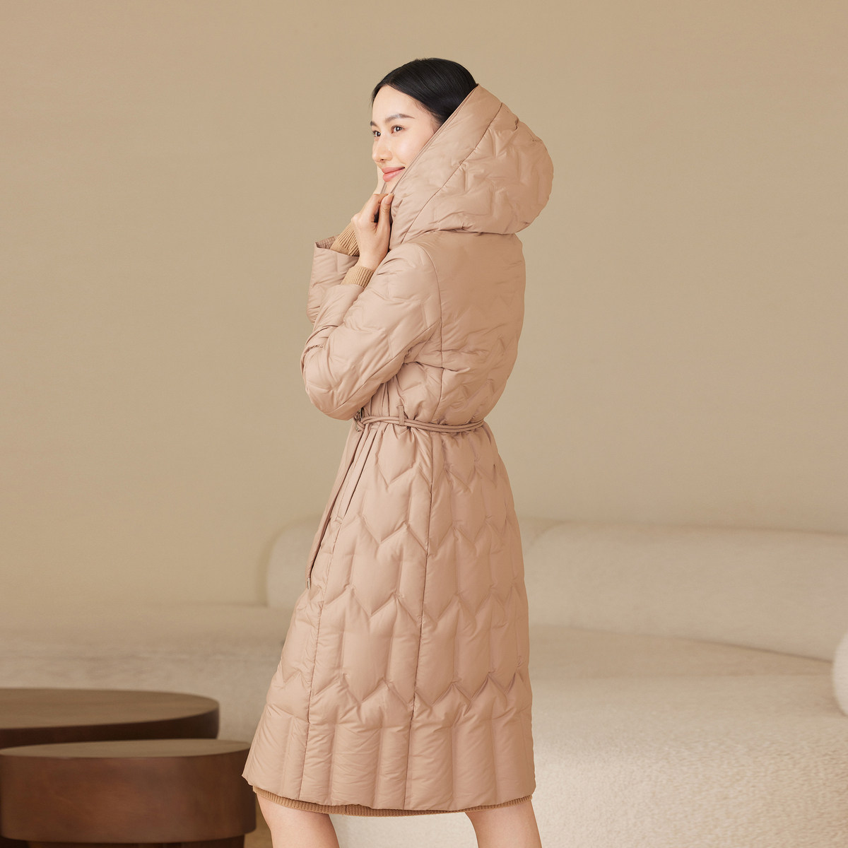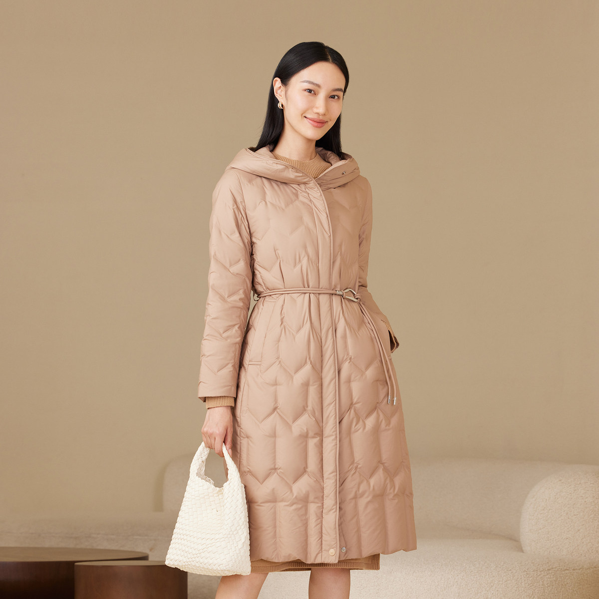 波司登奥莱秋款女长款经典时尚商务优雅气质连帽收腰轻薄羽绒服