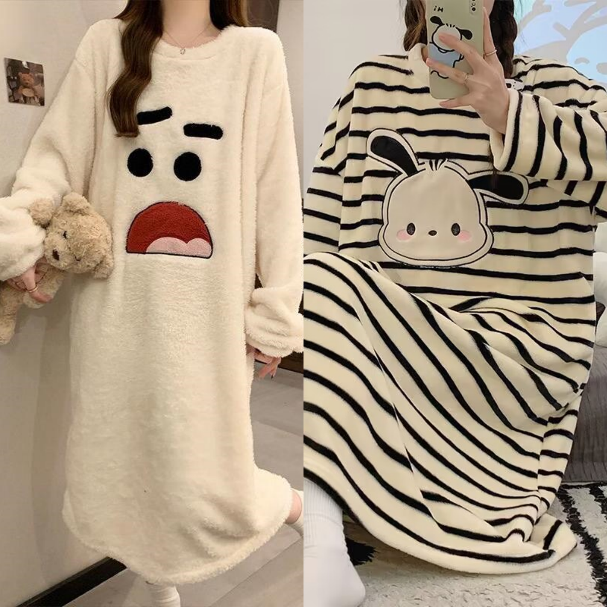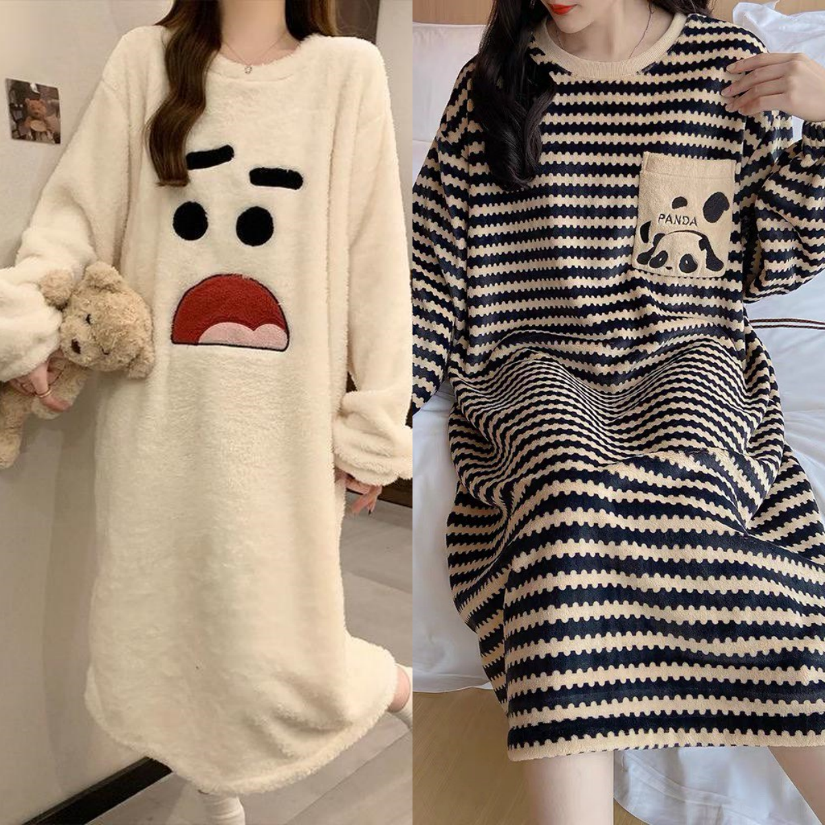 买一送一珊瑚绒法兰绒睡裙女冬季长袖卡通可爱睡衣裙子睡袍可外穿