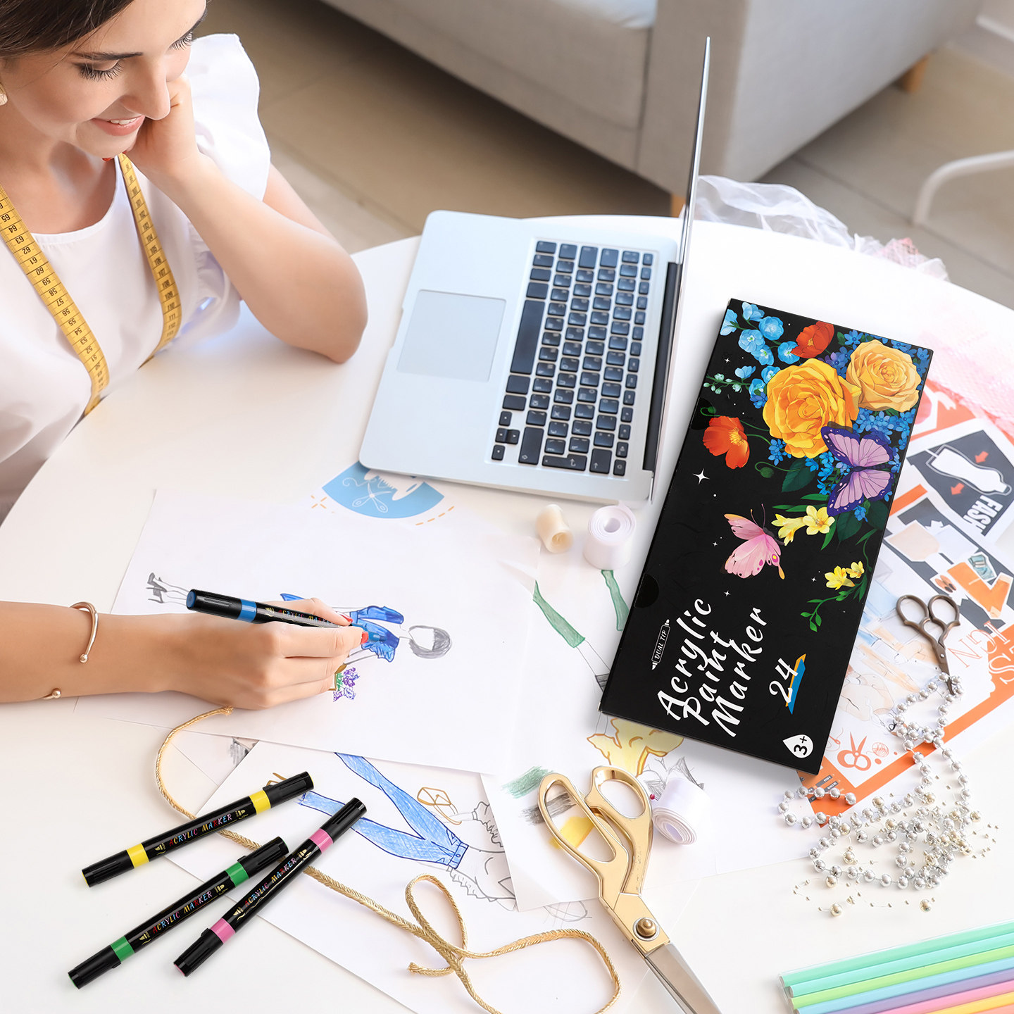 直液式丙烯马克笔软头小学生美术专用水彩笔儿童颜色笔可水洗24色画笔不透色48绘画可叠色彩色笔36水性丙烯笔