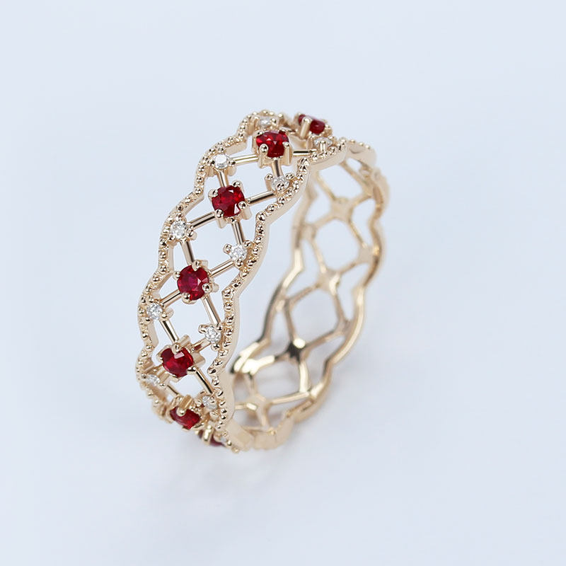 翡宝丽18k玫瑰金天然鸽血红宝石钻石戒指 彩宝复古镂空蕾丝珠边女