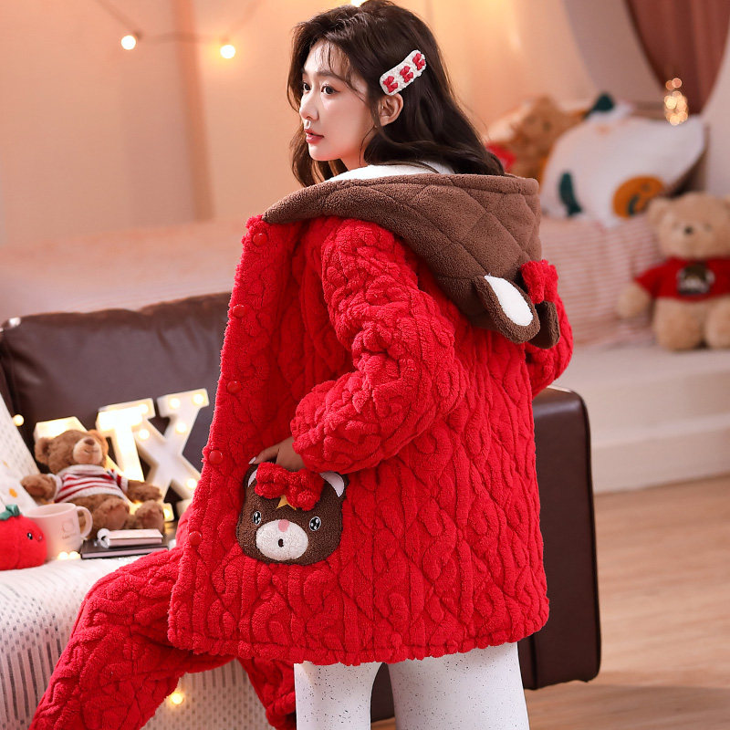 珊瑚绒睡衣女秋冬加绒加厚三层夹棉保暖女士中长款棉袄家居服套装