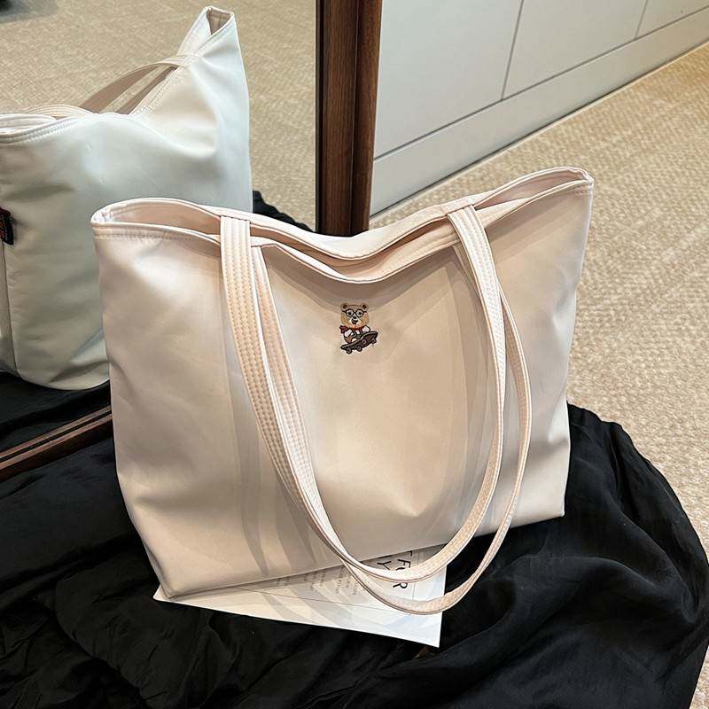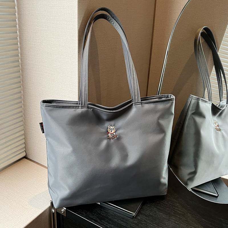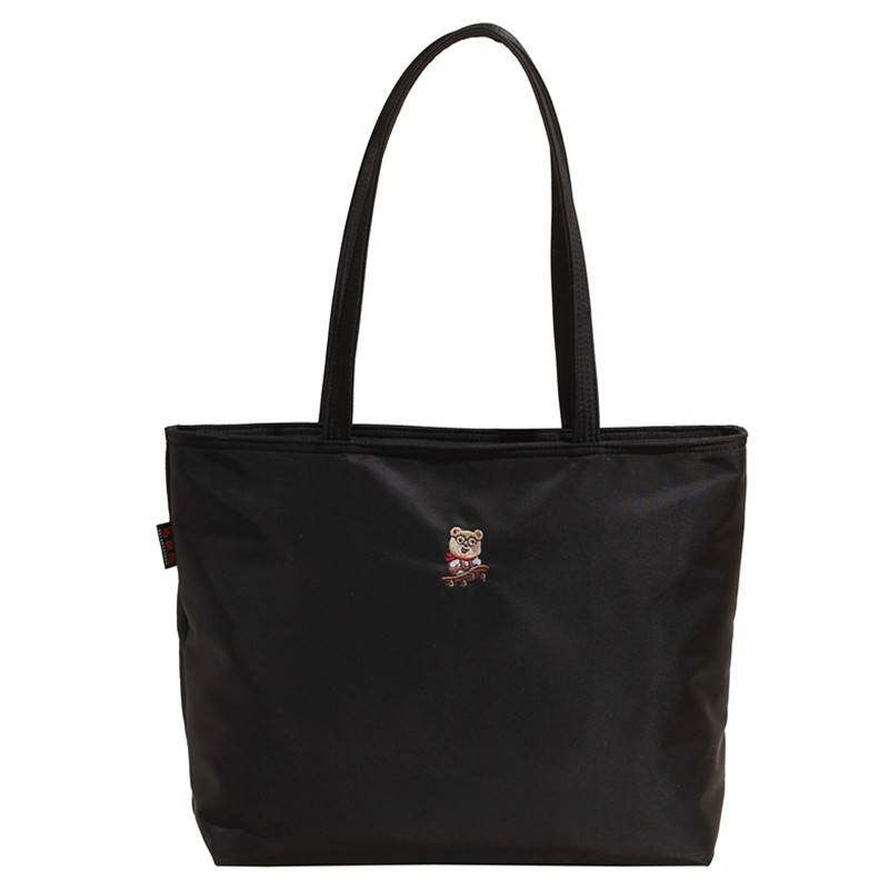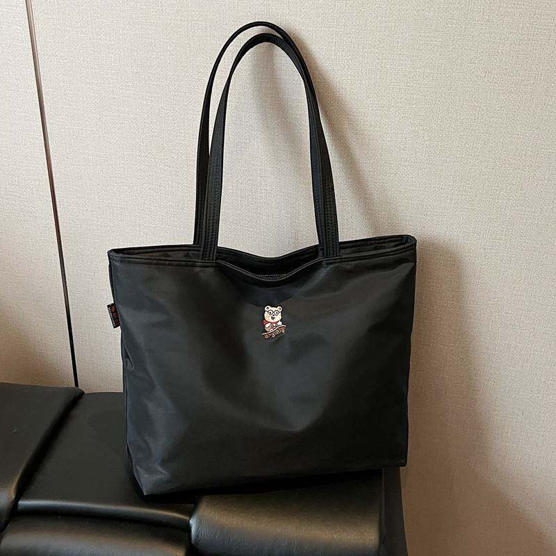 爱玛大容量托特包新款刺绣小熊尼龙帆布包通勤单肩手提购物袋黑色