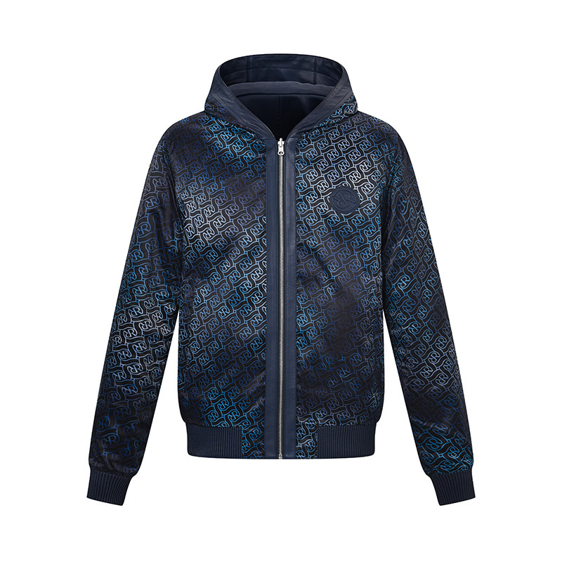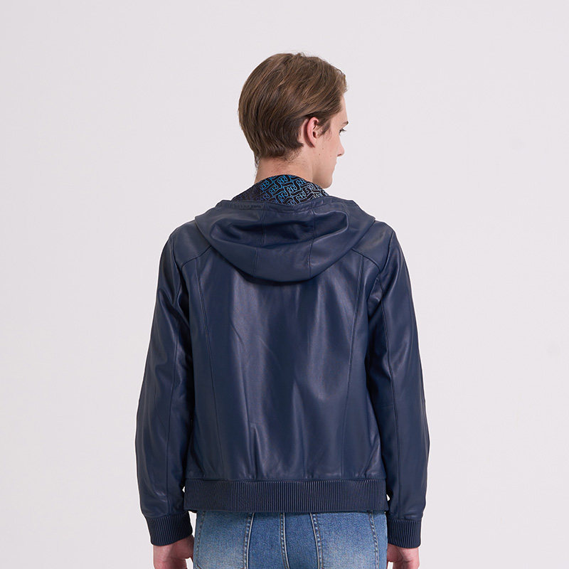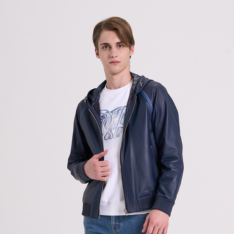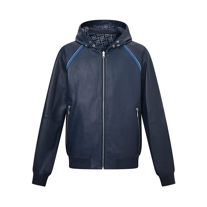 RARE威雅男装 肩部拼接撞色外套 秋冬新款藏青双面穿连帽皮衣夹克