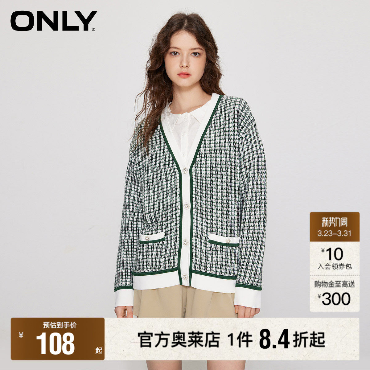 【ONLY奥莱】春季新款时尚撞色格纹V领长袖开衫针织衫女