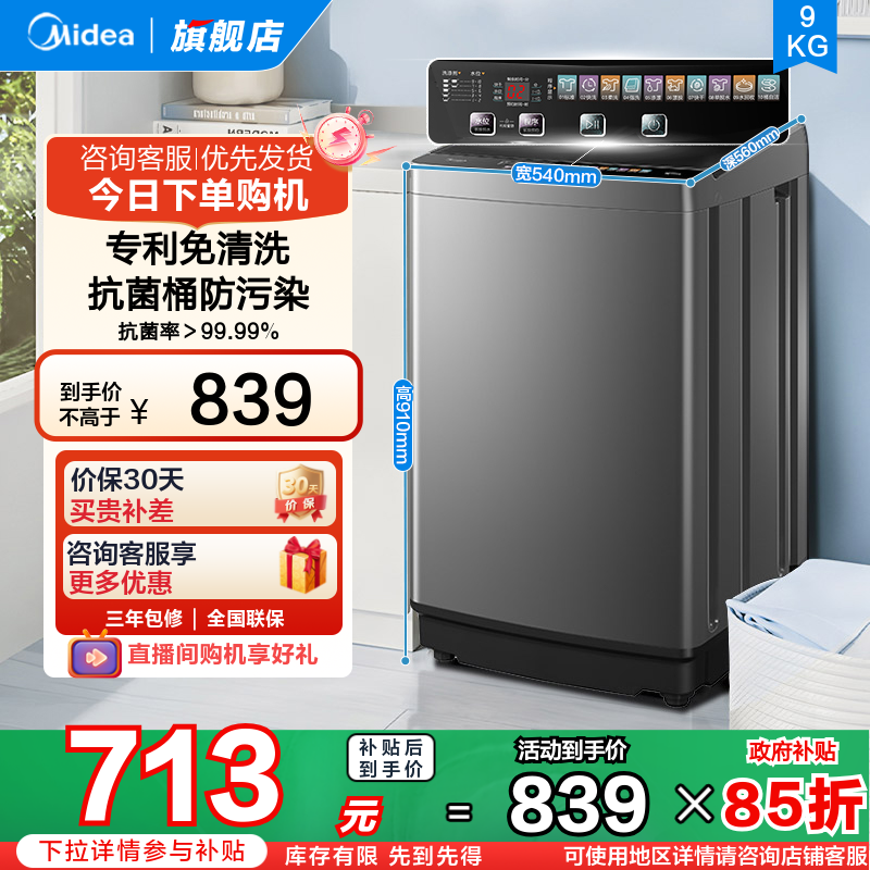 [以旧换新补贴]美的9kg波轮洗衣机全自动家用租房大容量洗脱一体