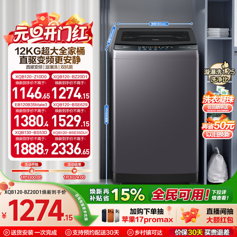 洗衣机以旧换新补贴海尔波轮全自动家用12kg超大容量除菌20D1