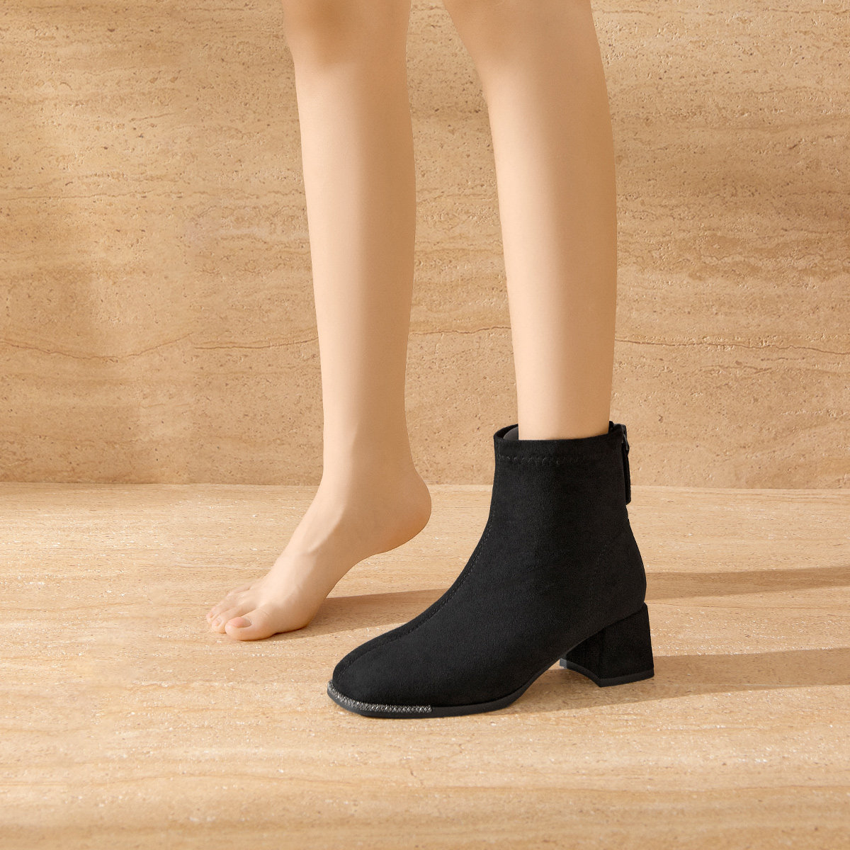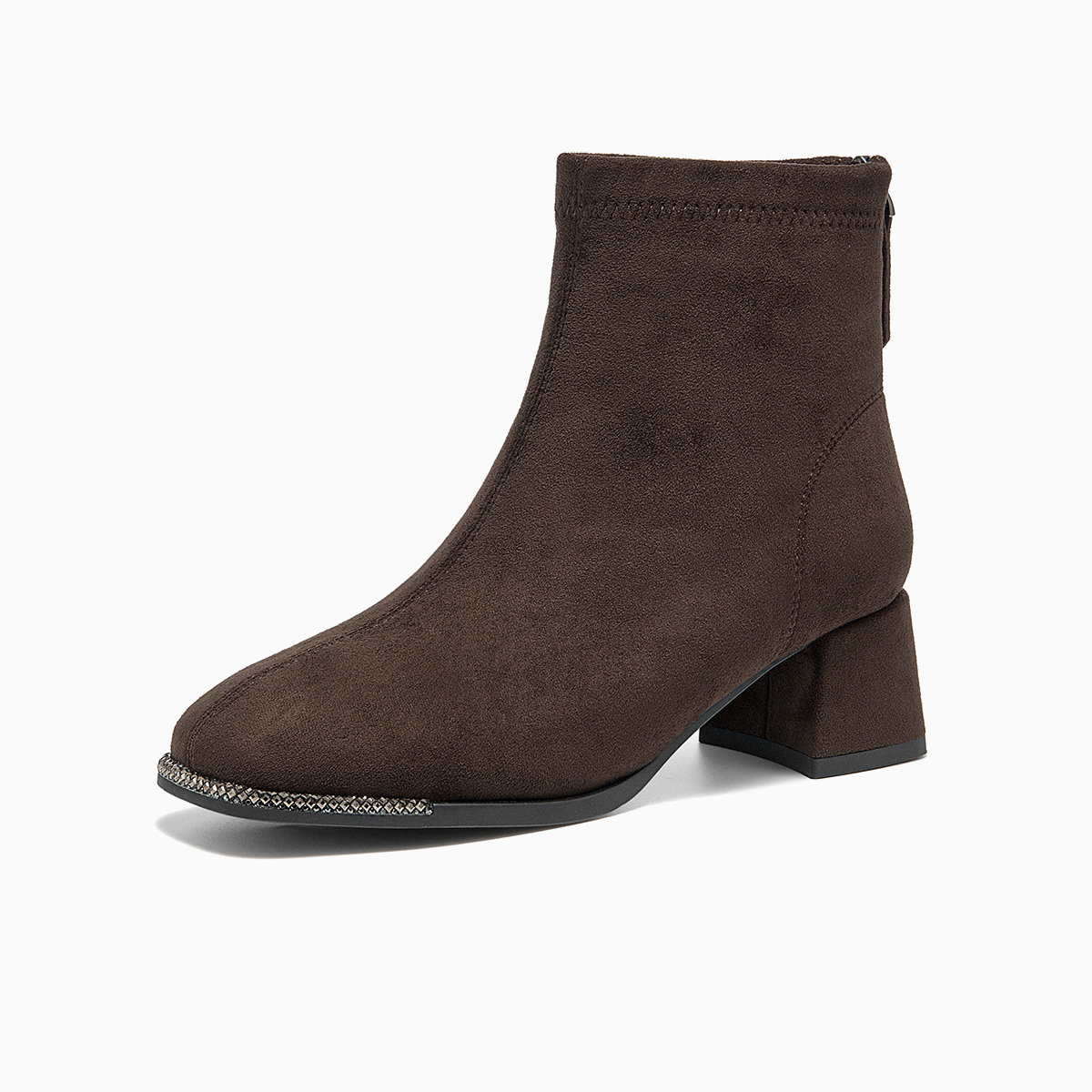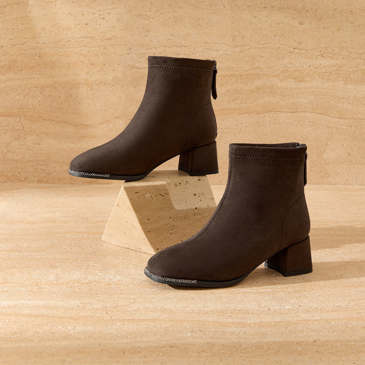 棕色靴子!小个子内增高7CM法式方头靴2025冬新款绒面粗跟短靴女