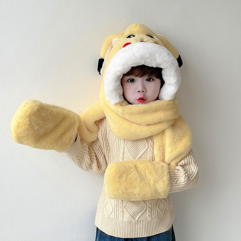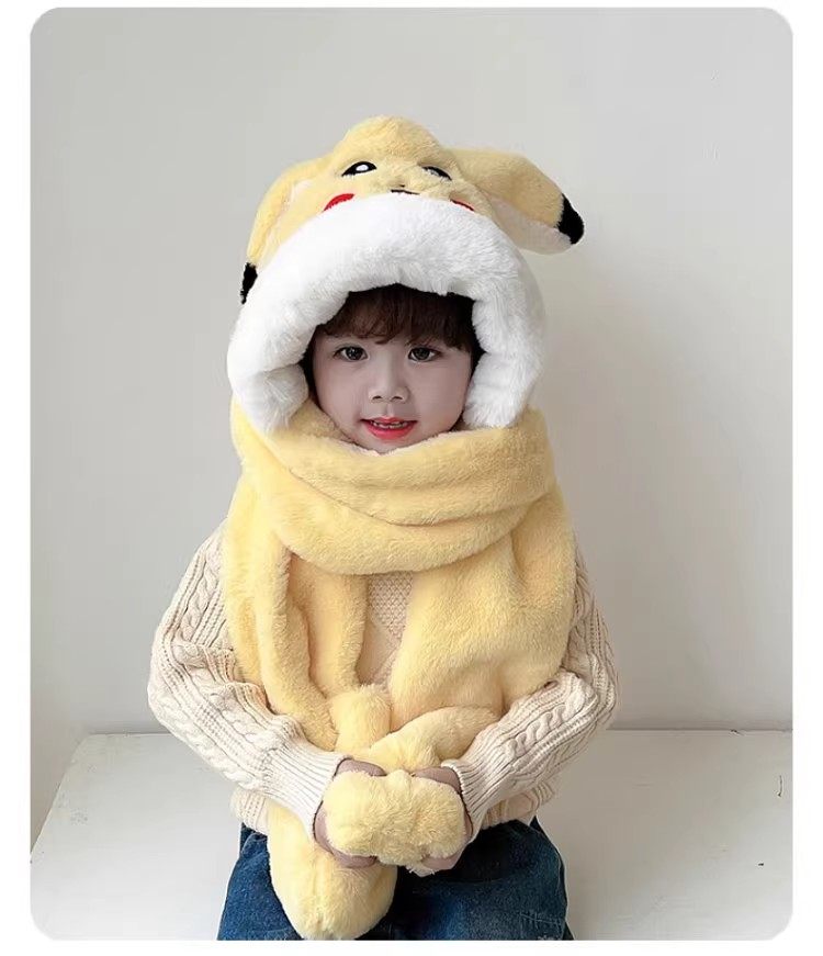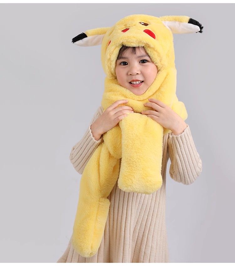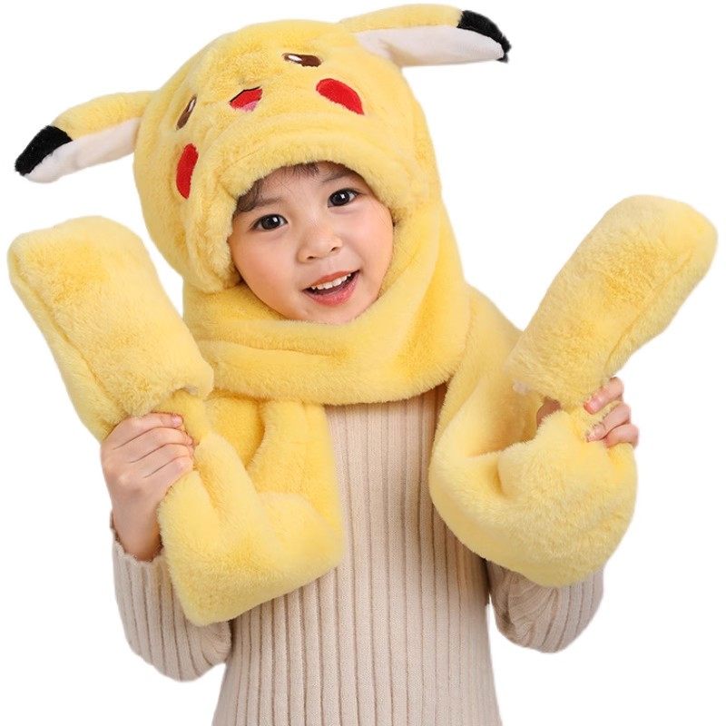 儿童帽子冬季皮卡丘耳朵会动围巾手套一体毛绒帽男童女童护脖护耳