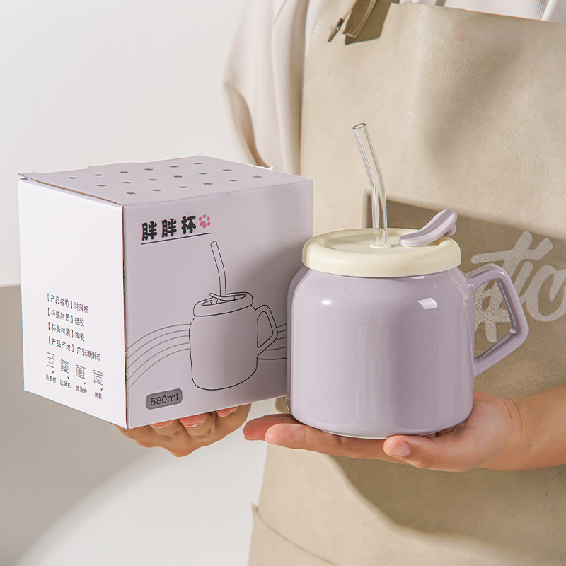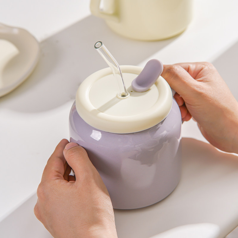 大容量奶油风杯子陶瓷带盖吸管马克杯女生高颜值家用办公室喝水杯