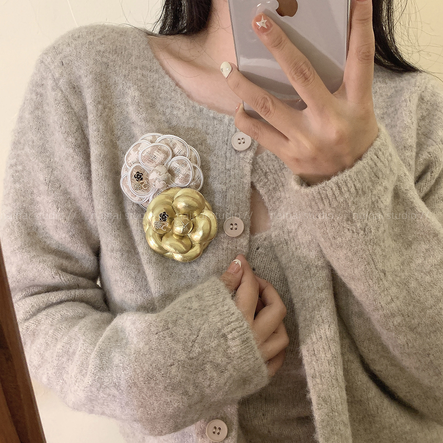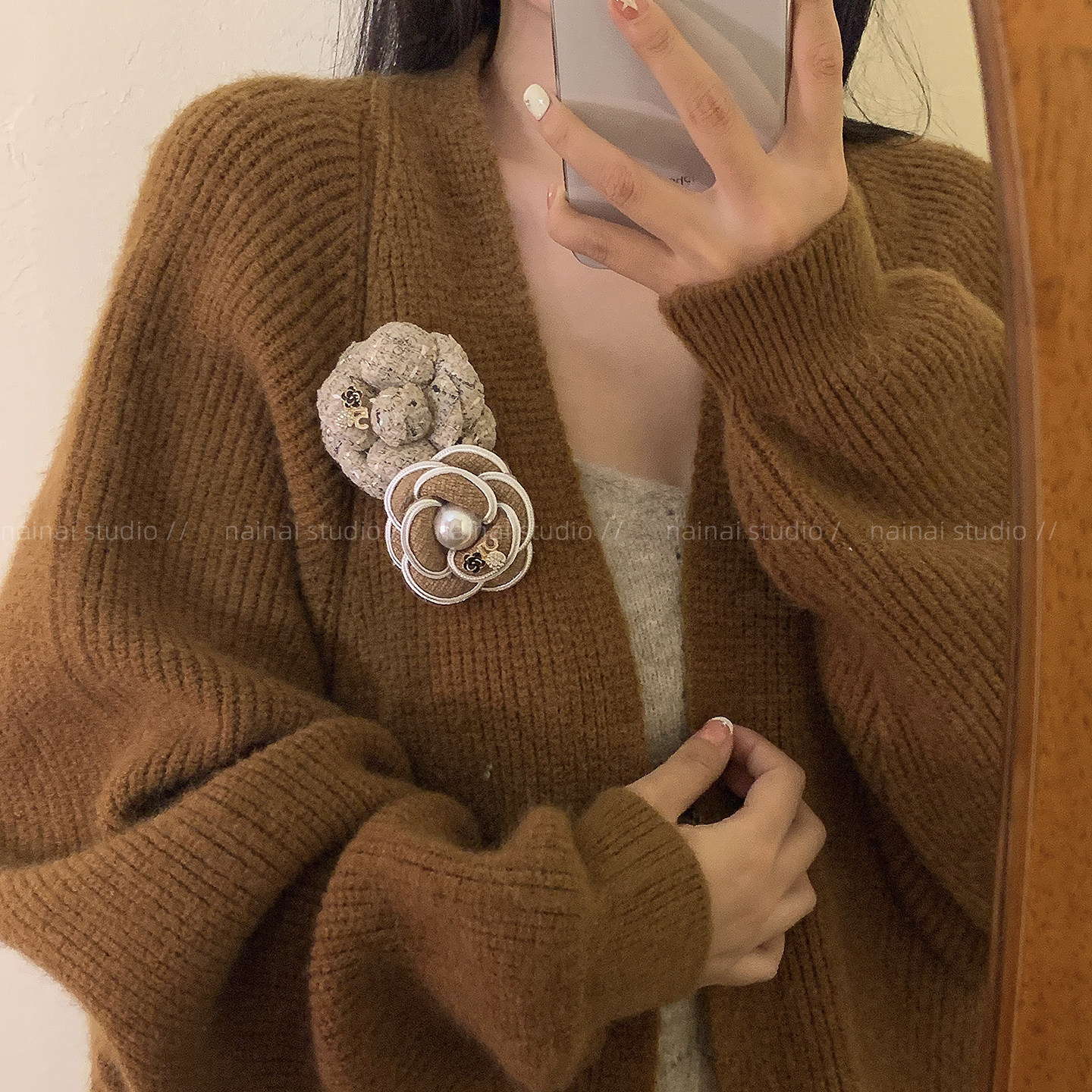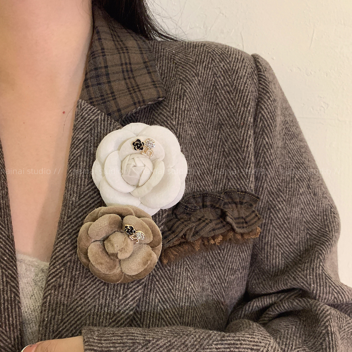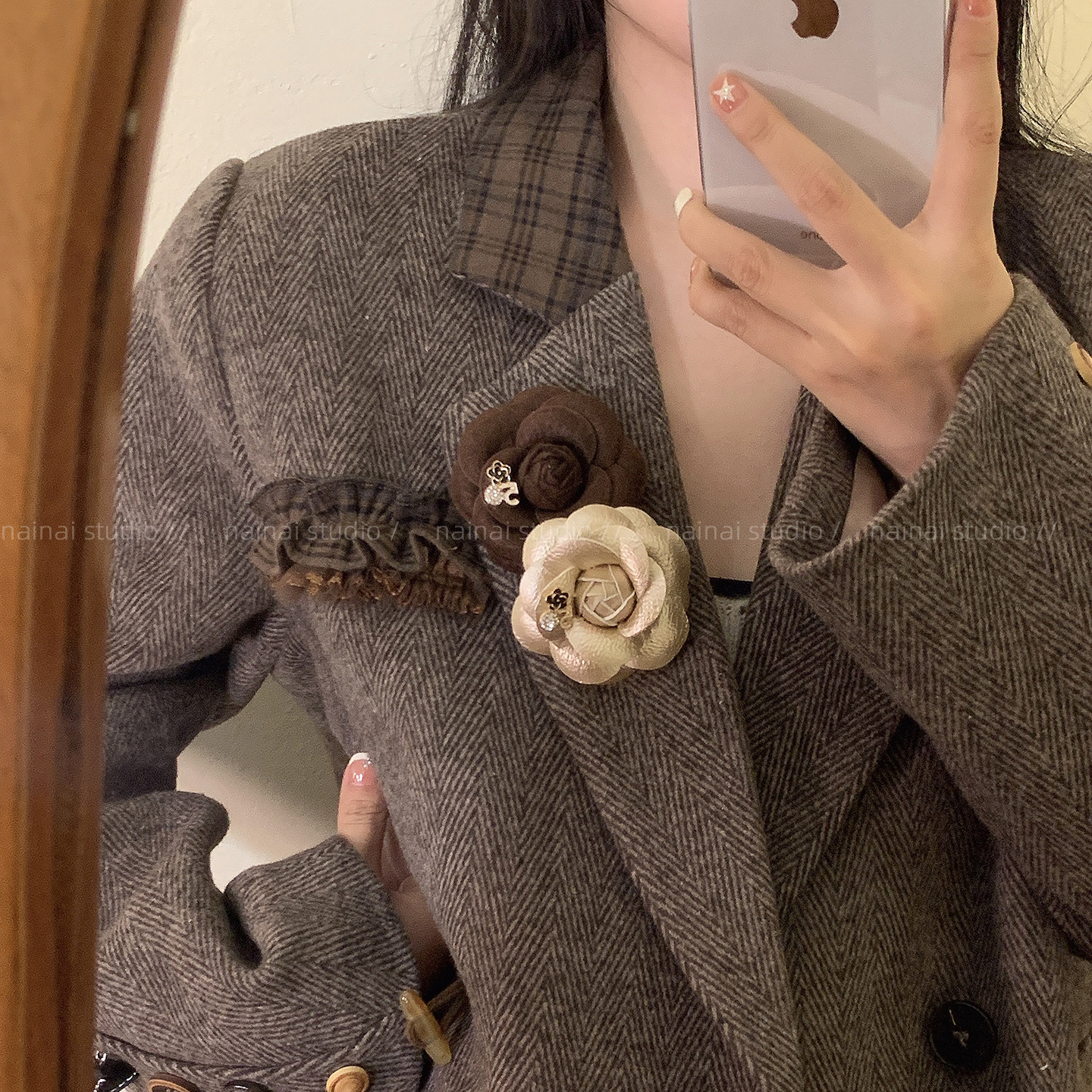 美拉德风咖色系胸针~自制小香风硬挺山茶花复古法式胸花别针配饰