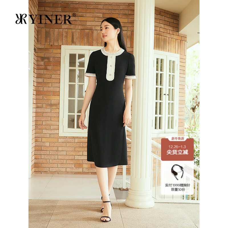 【雅致小黑裙】YINER音儿专选2025秋季新款撞色雪纺珠钻链连衣裙