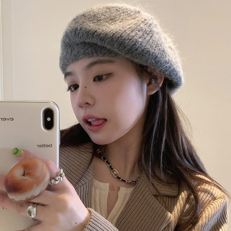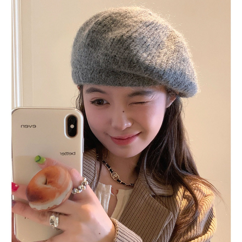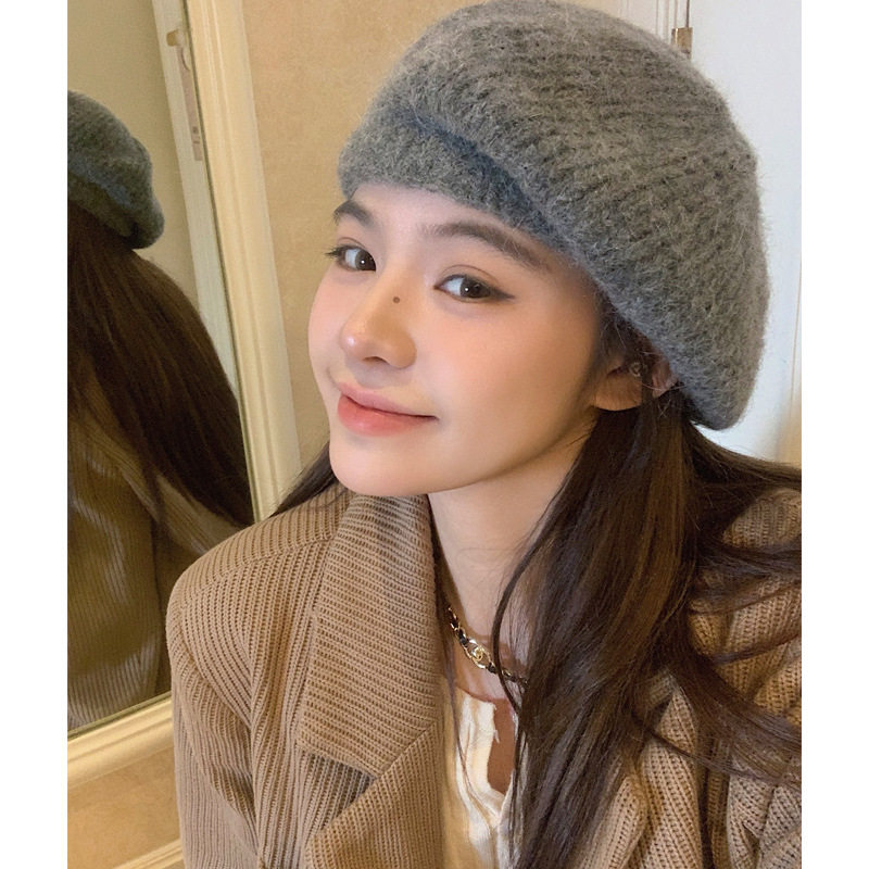 马海毛针织贝雷帽女秋冬画家帽2024新款大头围显脸小灰色毛线帽子