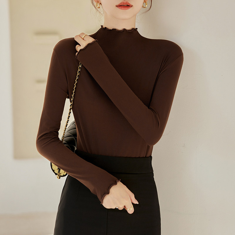 咖色莫代尔半高领打底衫女内搭2025新款秋冬季木耳边保暖长袖上衣