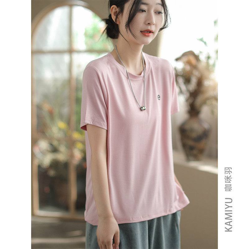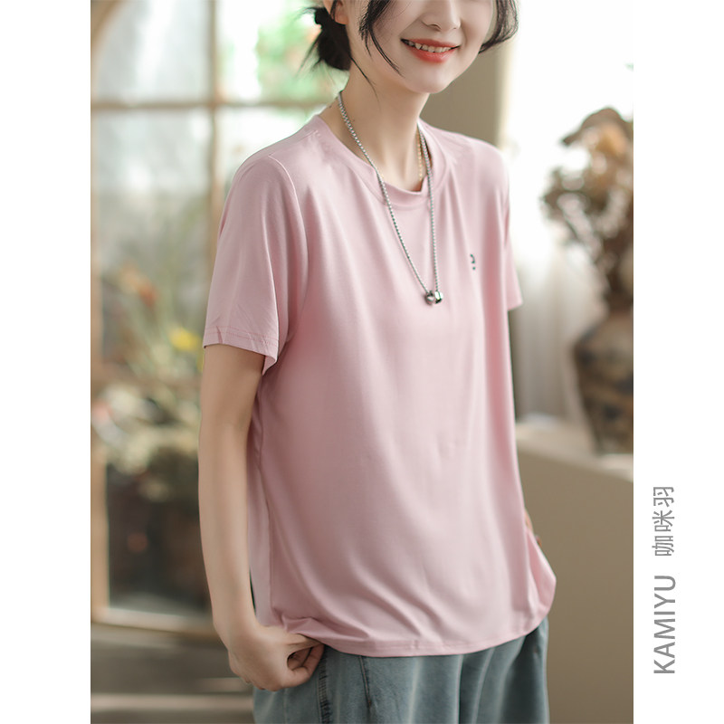 咖咪羽100%棉夏装新款纯色圆领复古百搭时尚显瘦女装上衣T恤女