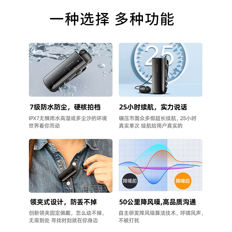 新款蓝牙耳机夹领式无线降噪麦克风开车骑行防水外卖代驾超长续航