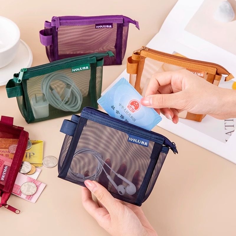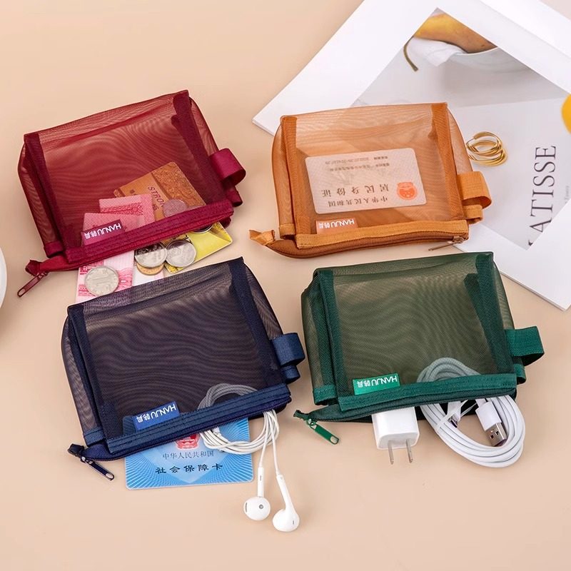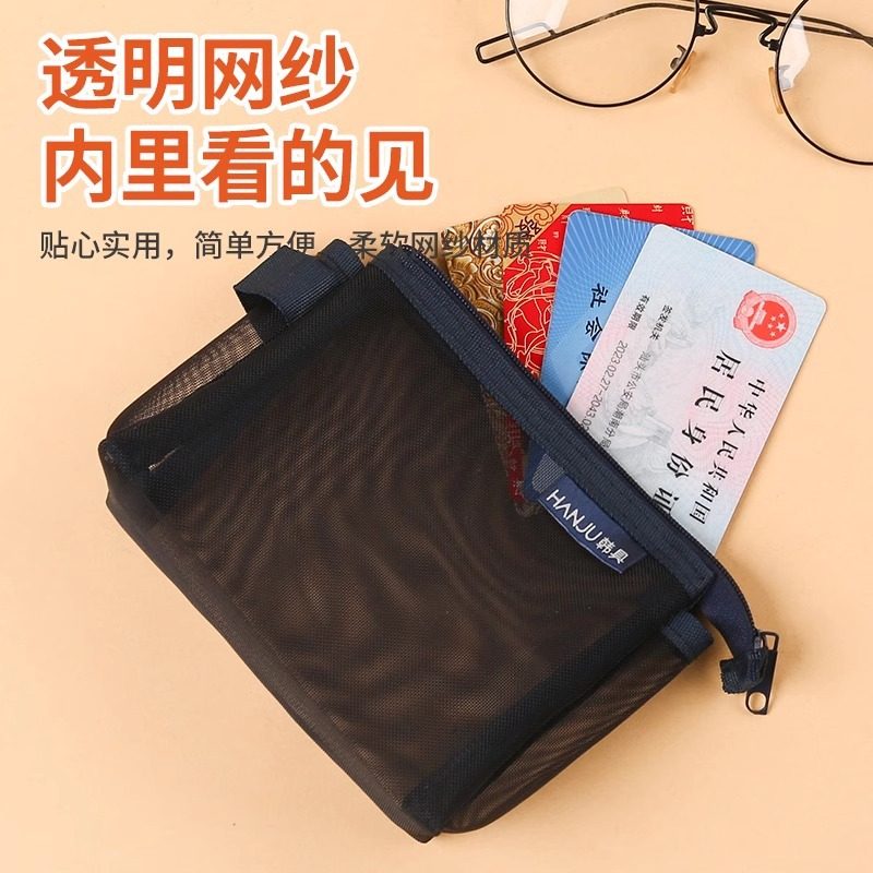 复古色三角立体透明尼龙网纱拉链包迷你零钱袋卡片袋银行卡收纳袋
