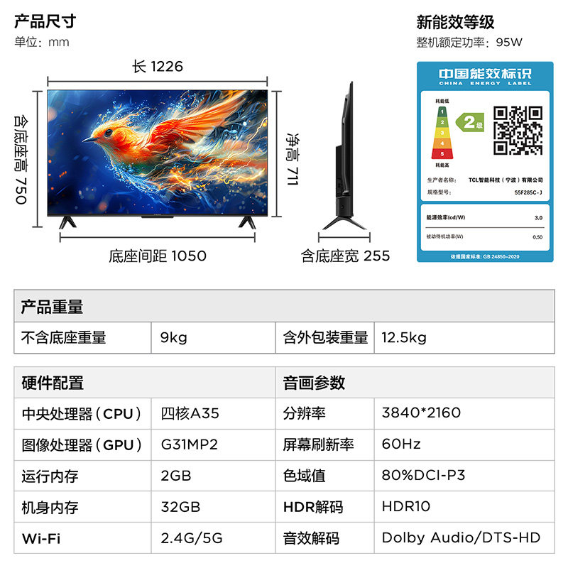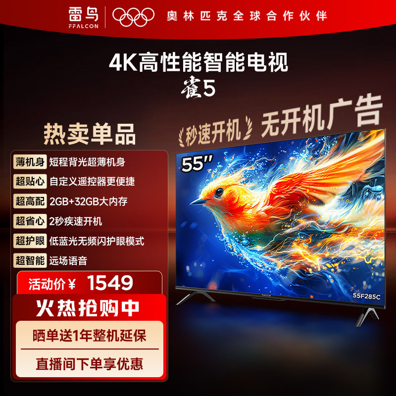 TCL雷鸟雀5 24款55英寸4K高清智能网络语音平板电视机二级能效