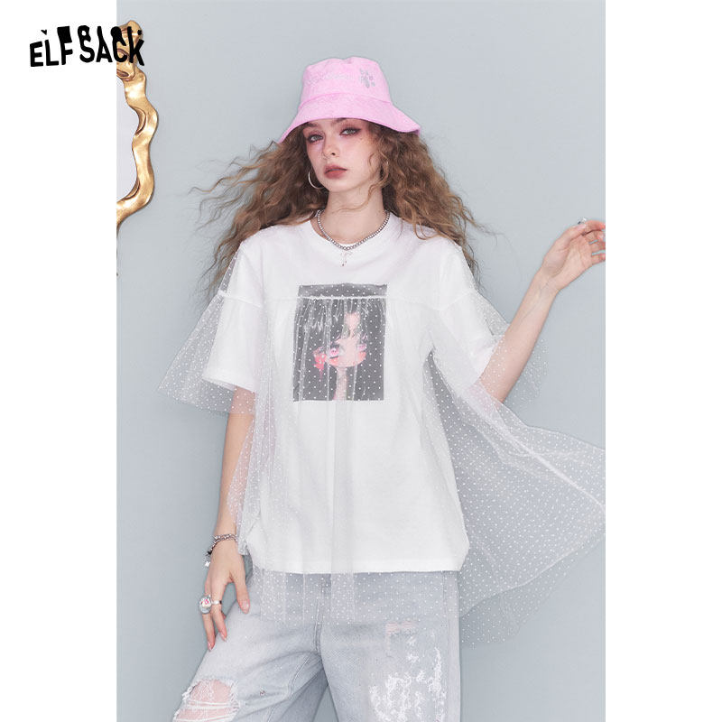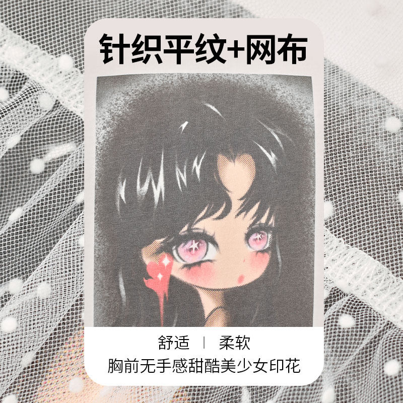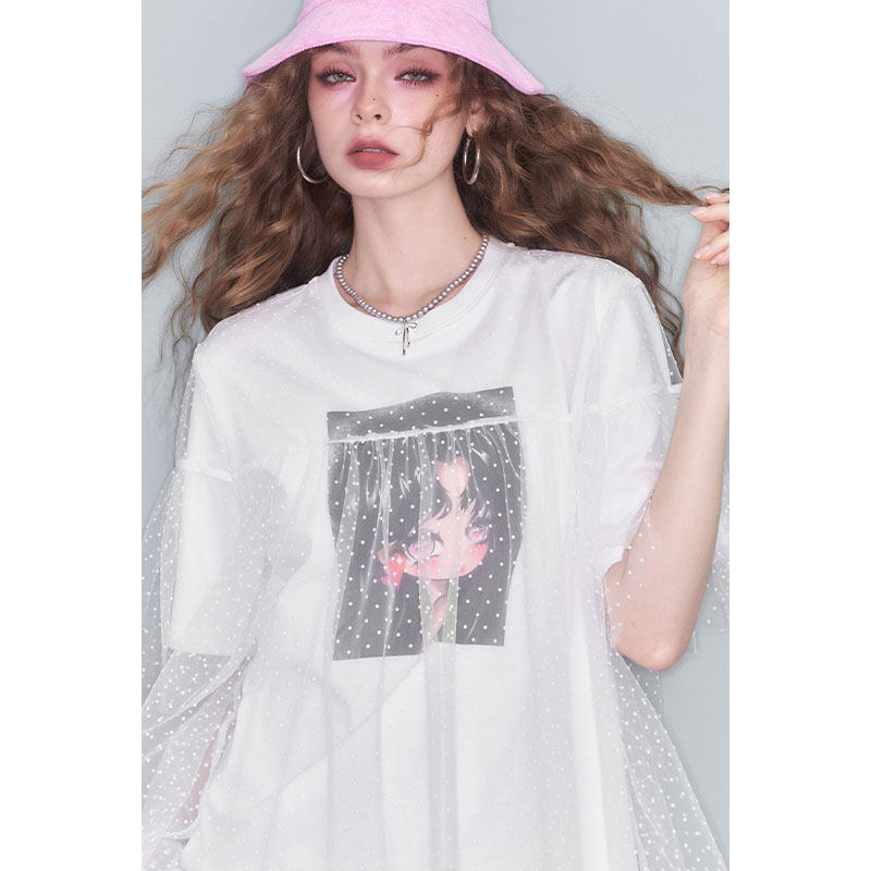 妖精的口袋波点网纱拼接白色印花短袖t恤女2025夏设计感小众上衣
