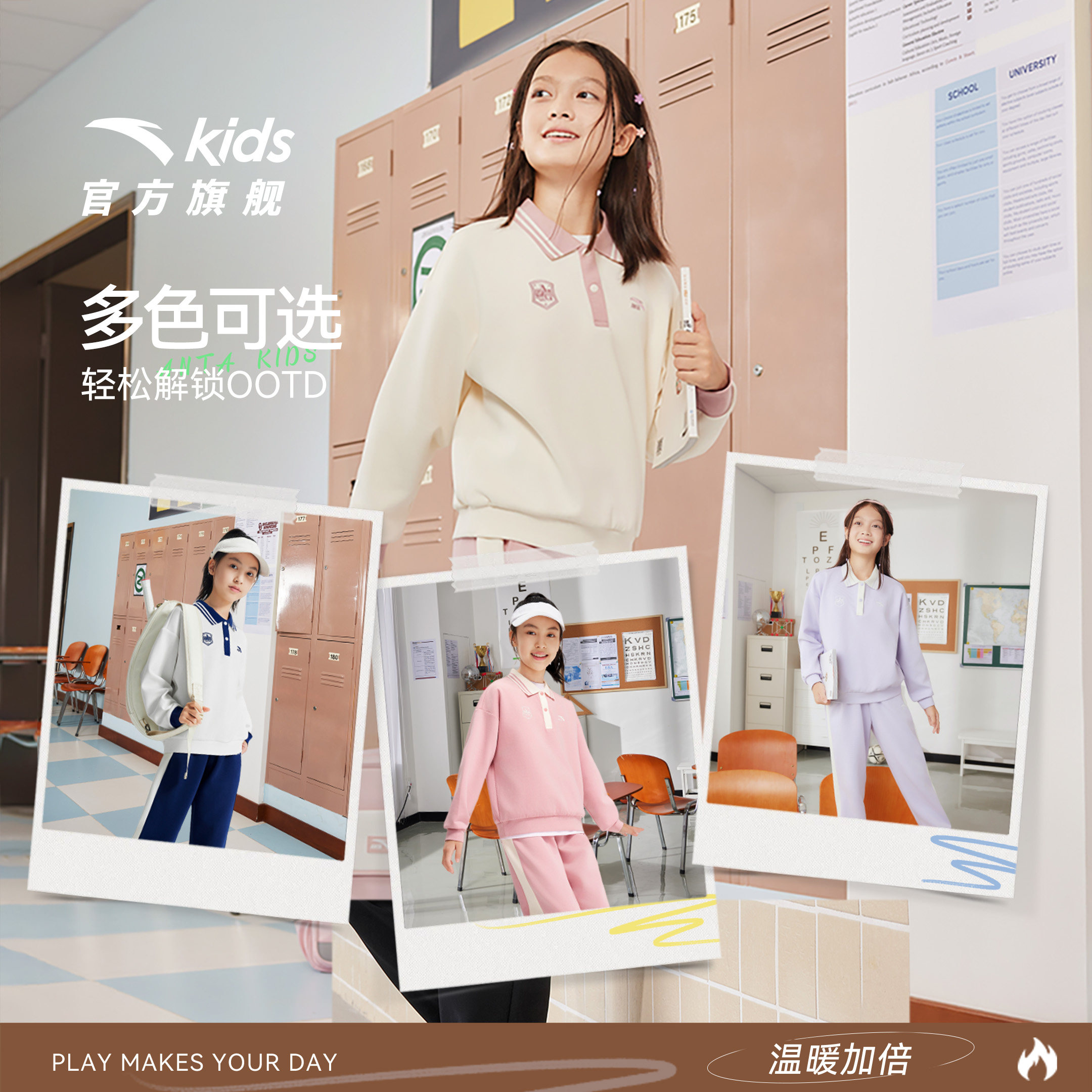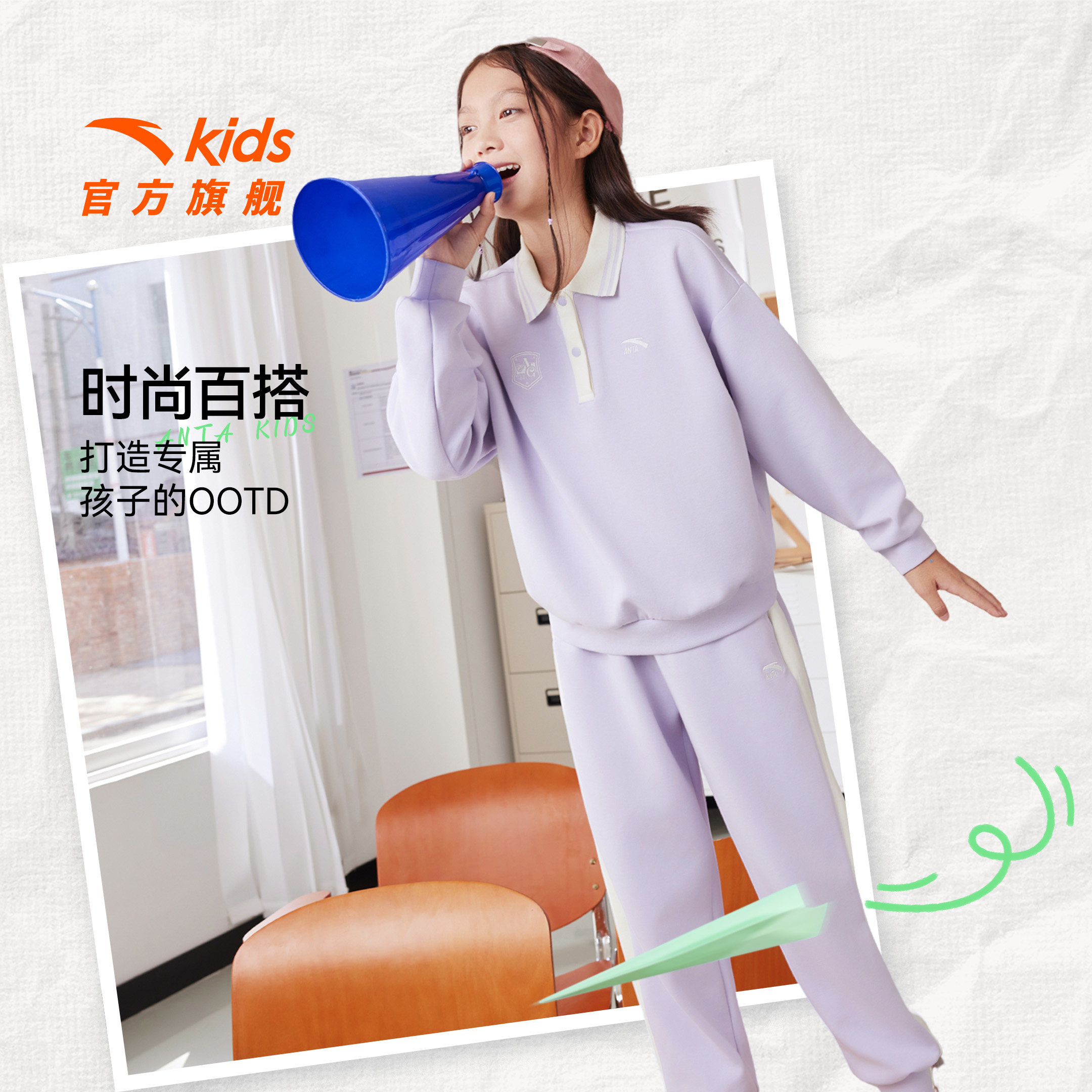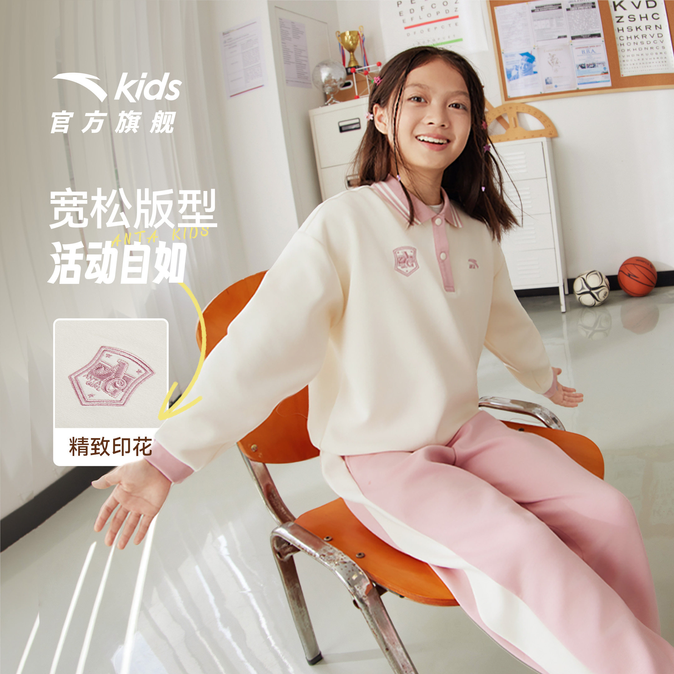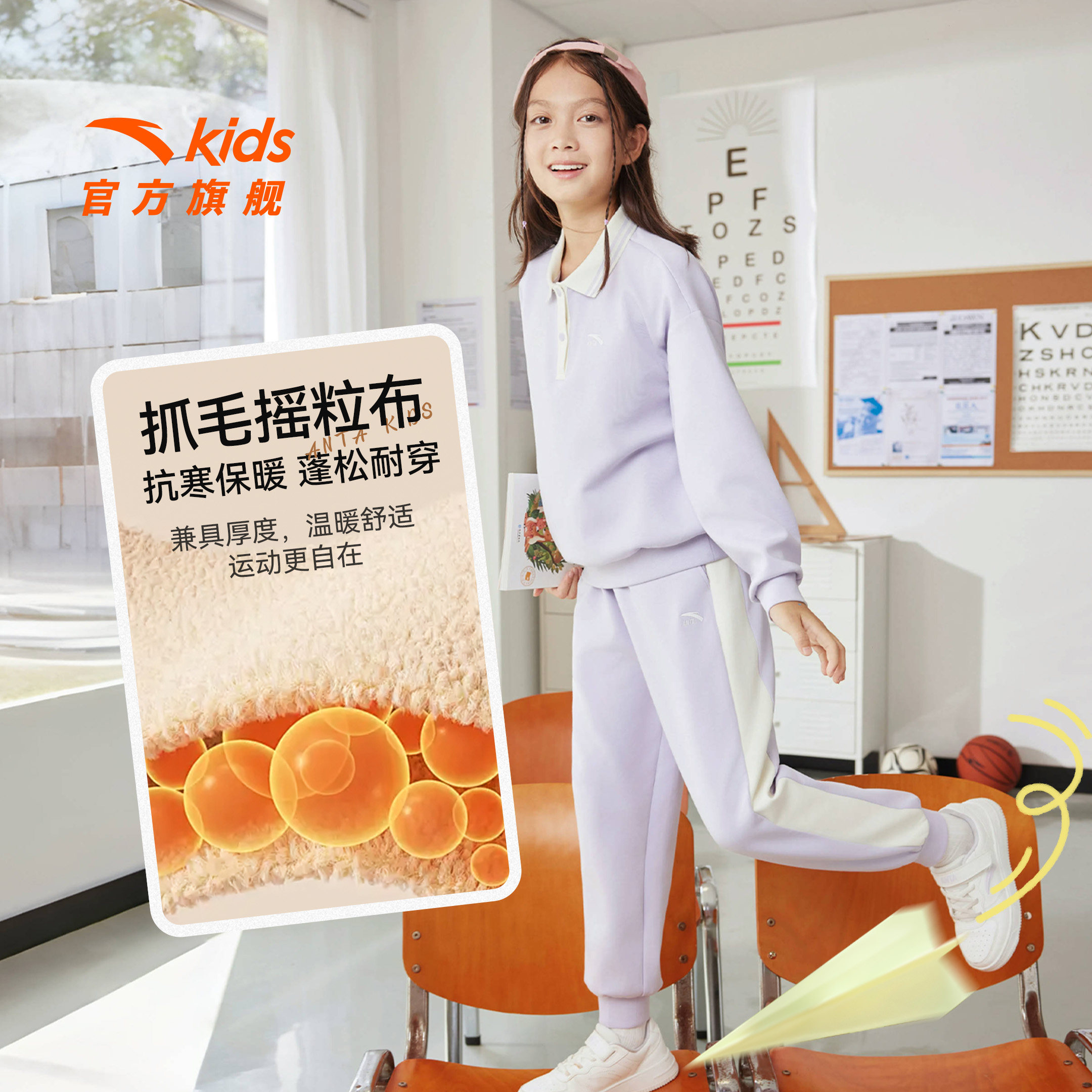 安踏儿童装女童针织运动套装加绒2025冬款舒适时尚卫衣裤子两件套