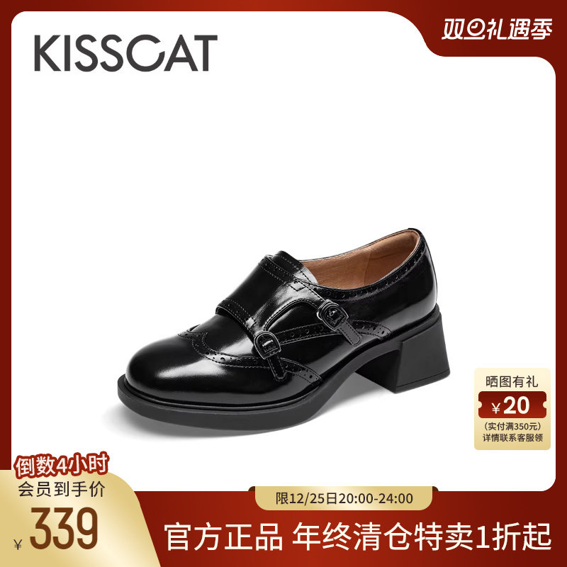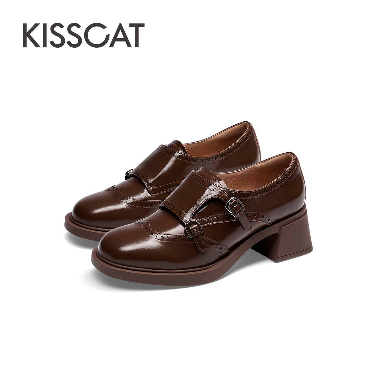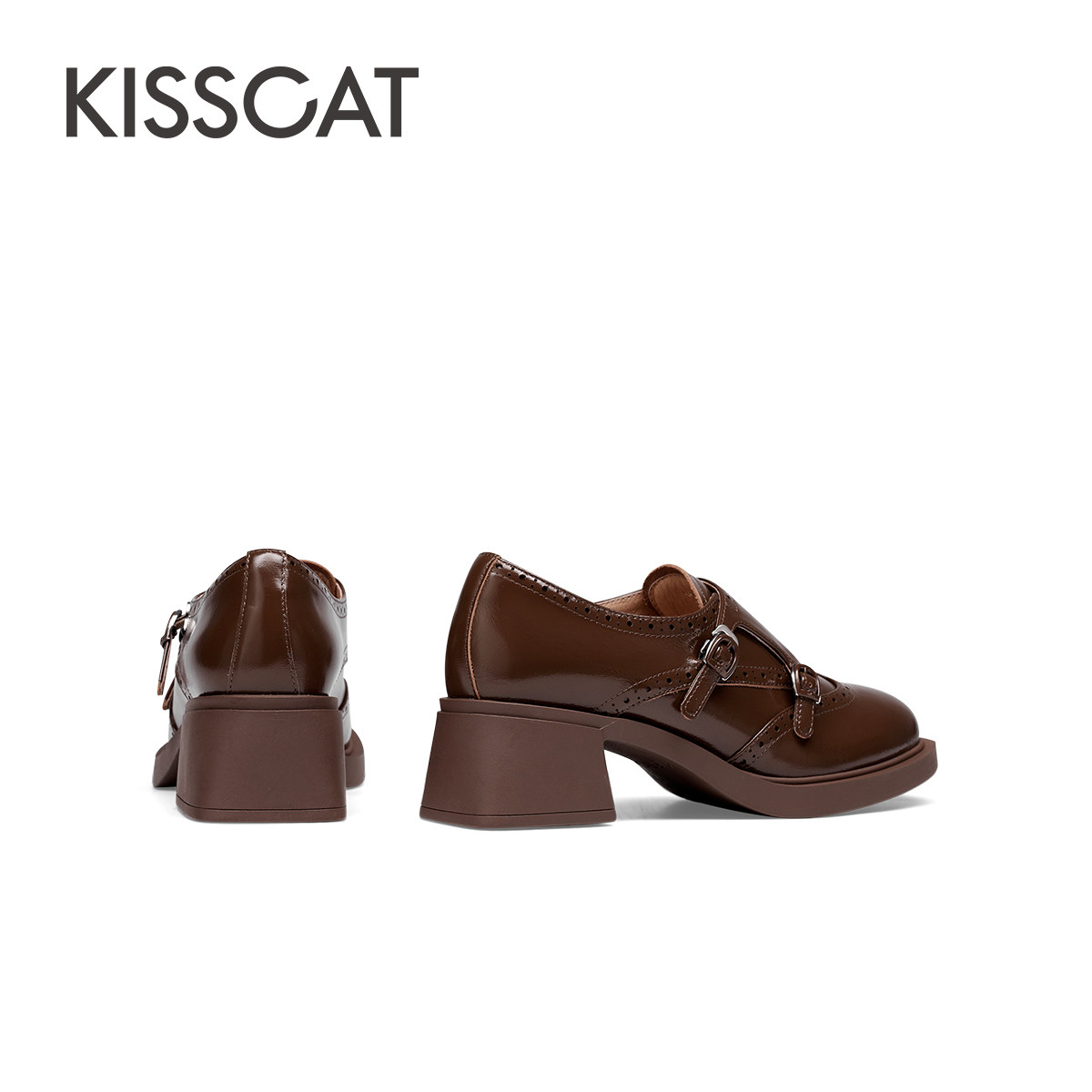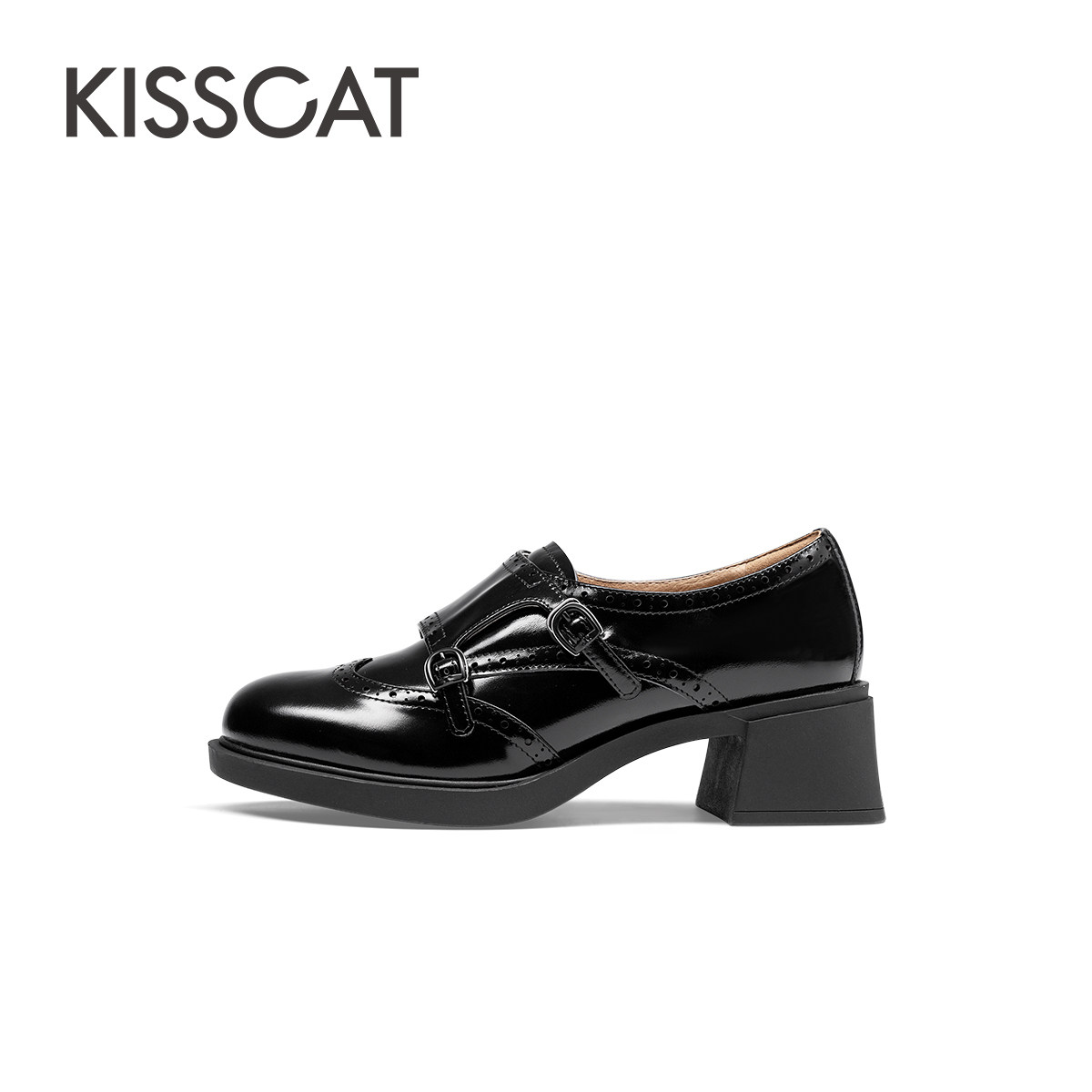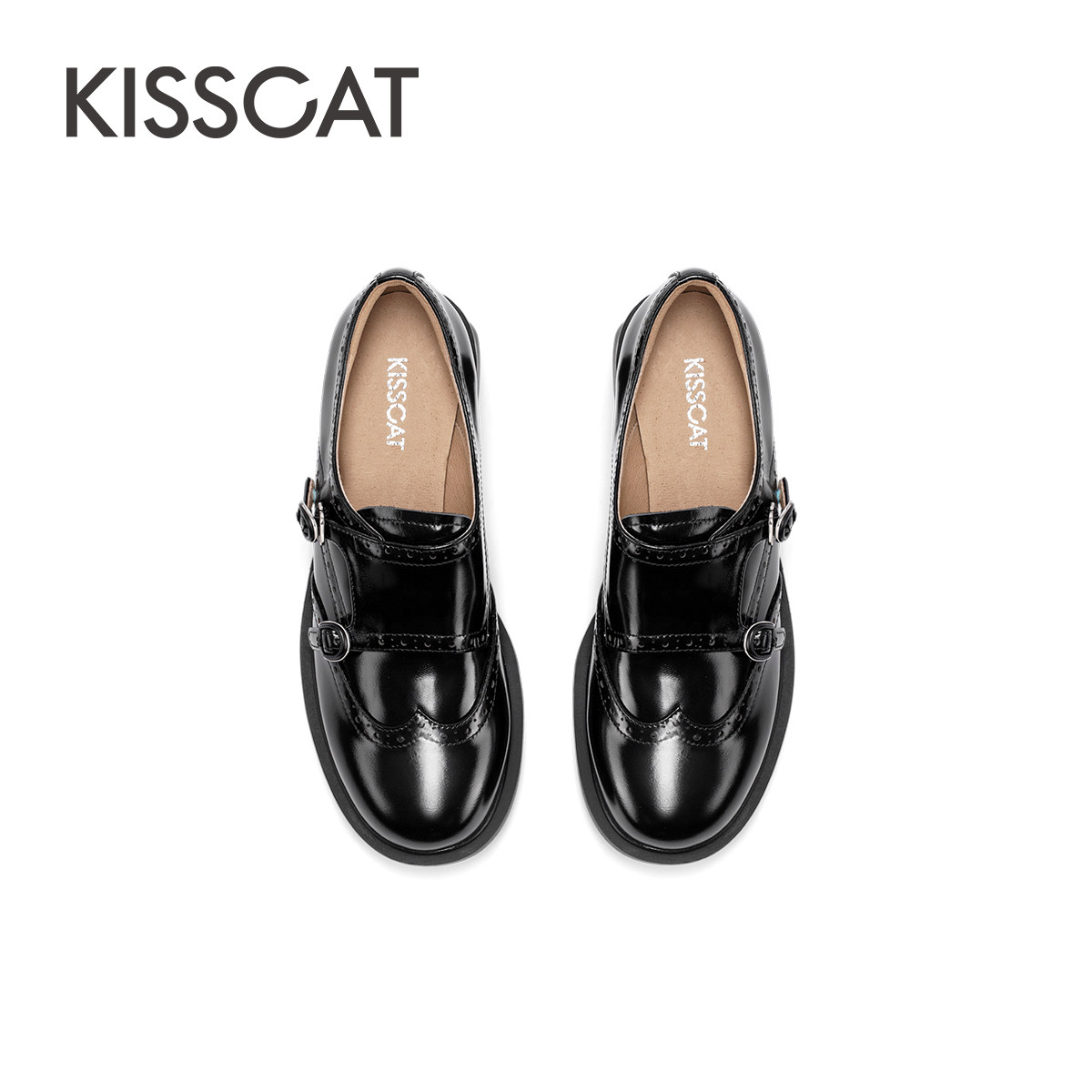 KISSCAT接吻猫新款布洛克鞋黑色小皮鞋女士通勤厚底增高乐福鞋女