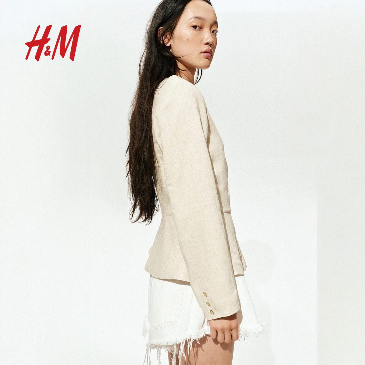 HM短外套2025年新款亚麻混纺裙式下摆外套1280961