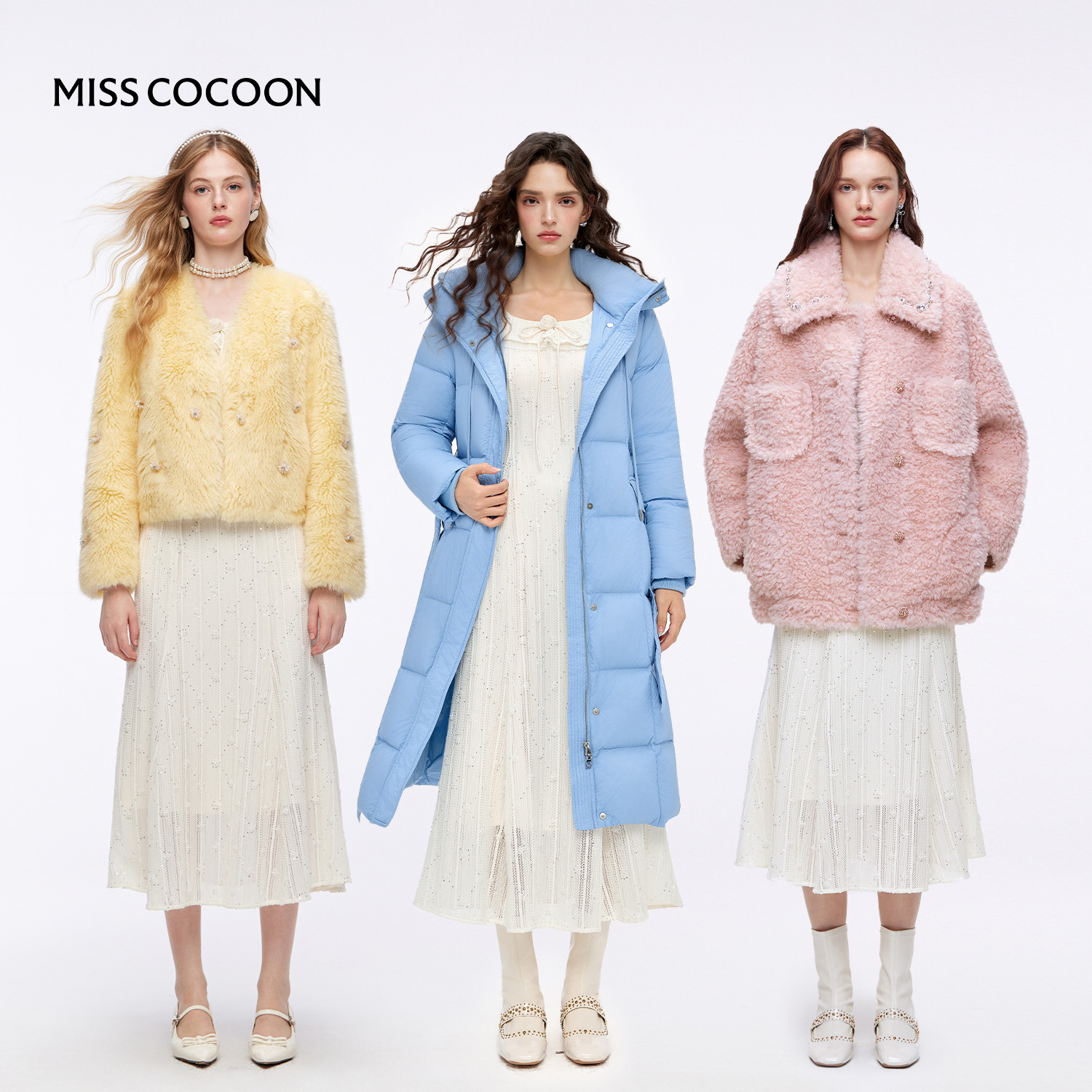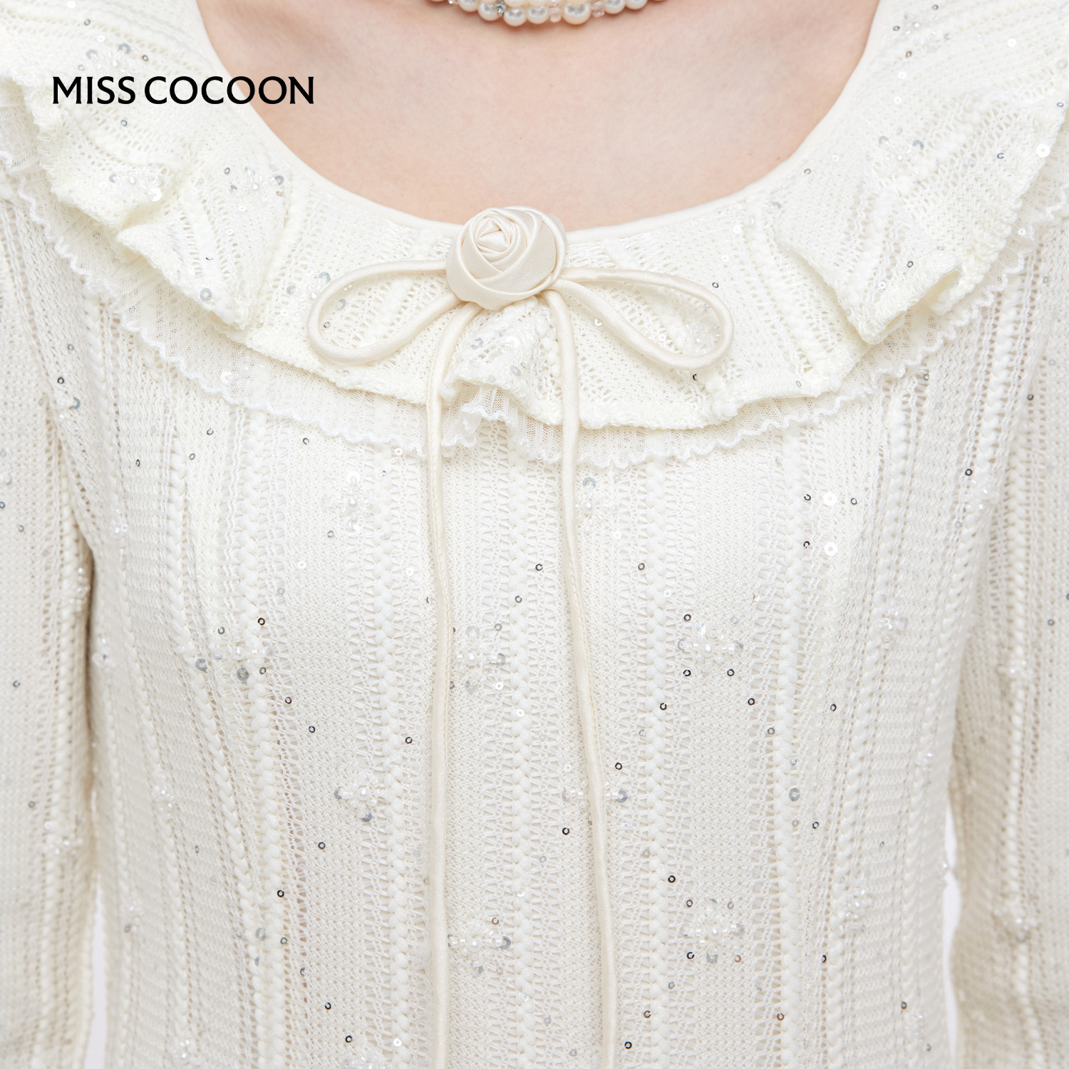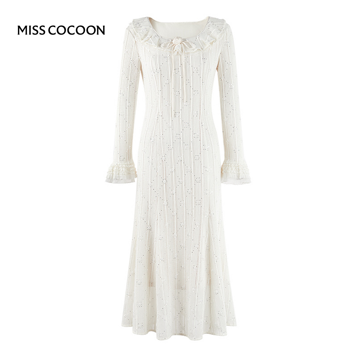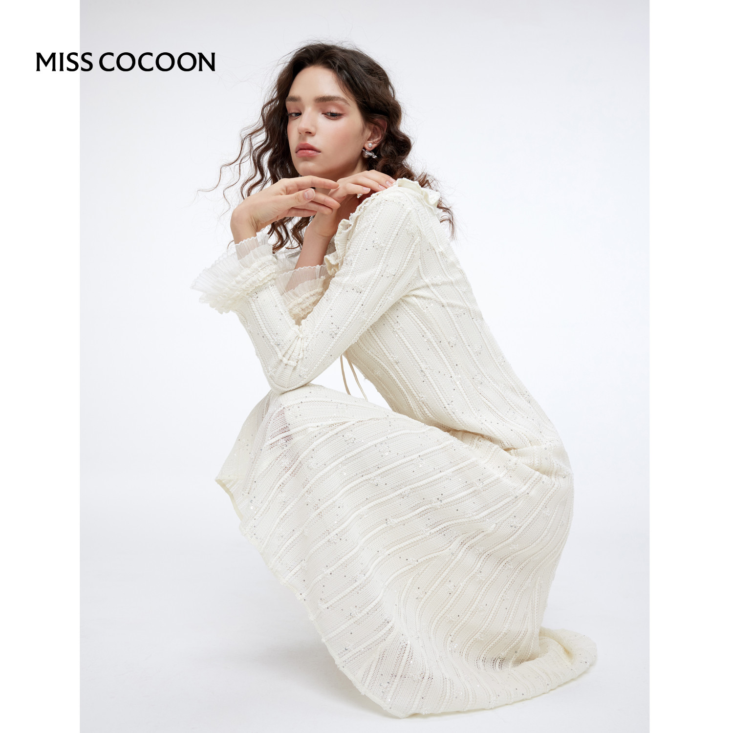 MISSCOCOON可可尼荷叶领针织长裙女2025秋冬新款蕾丝绣花连衣裙