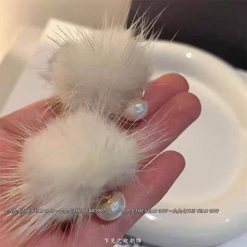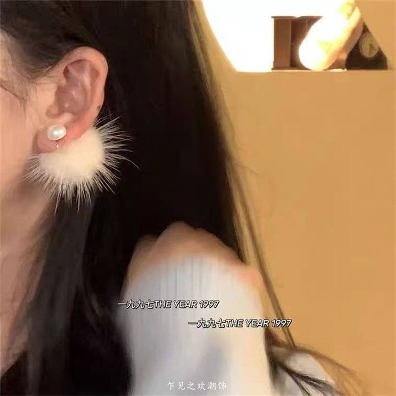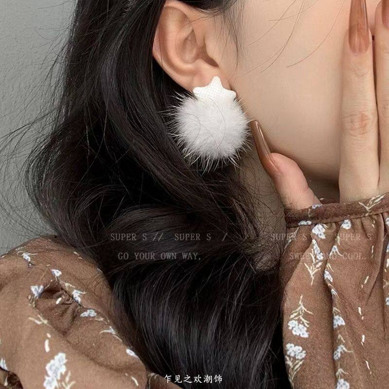 秋冬耳饰毛茸茸高级白色小众设计新款气质耳钉耳环耳夹无耳洞温柔