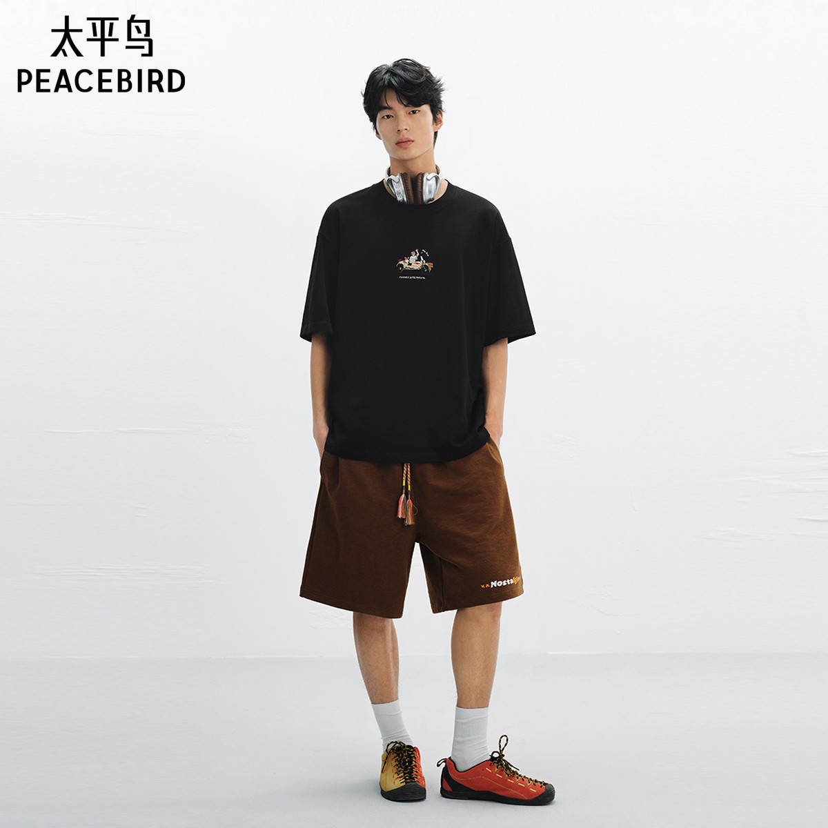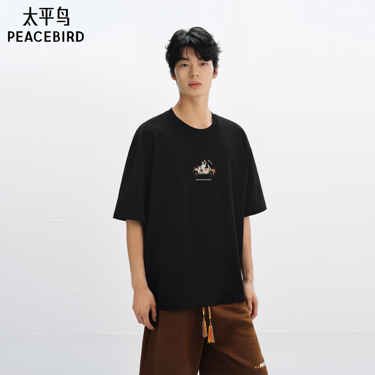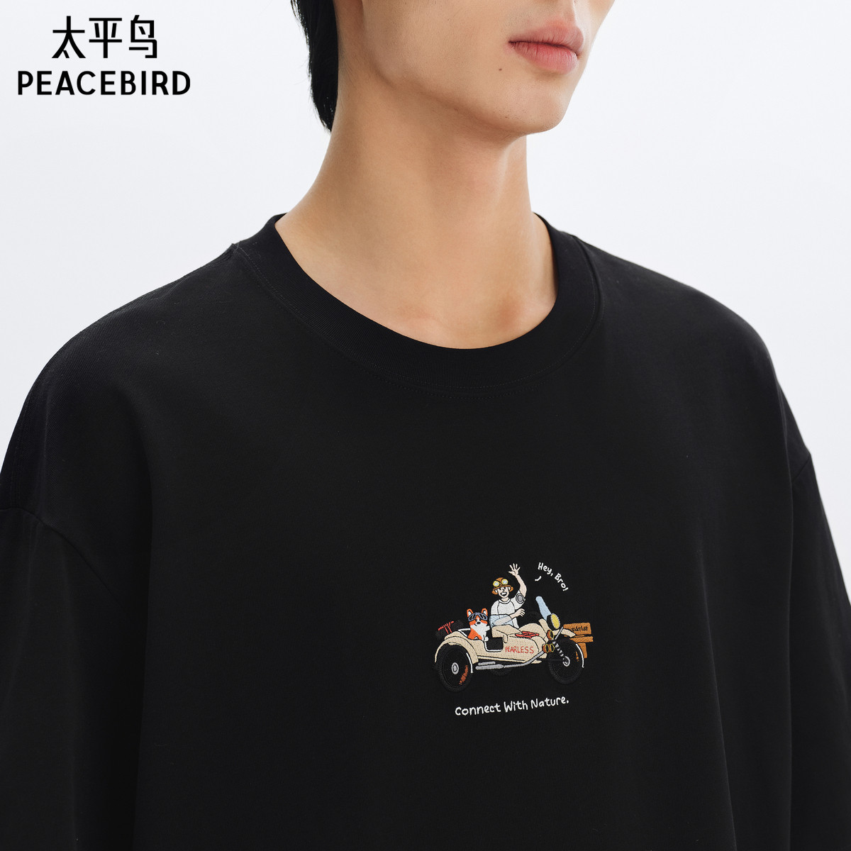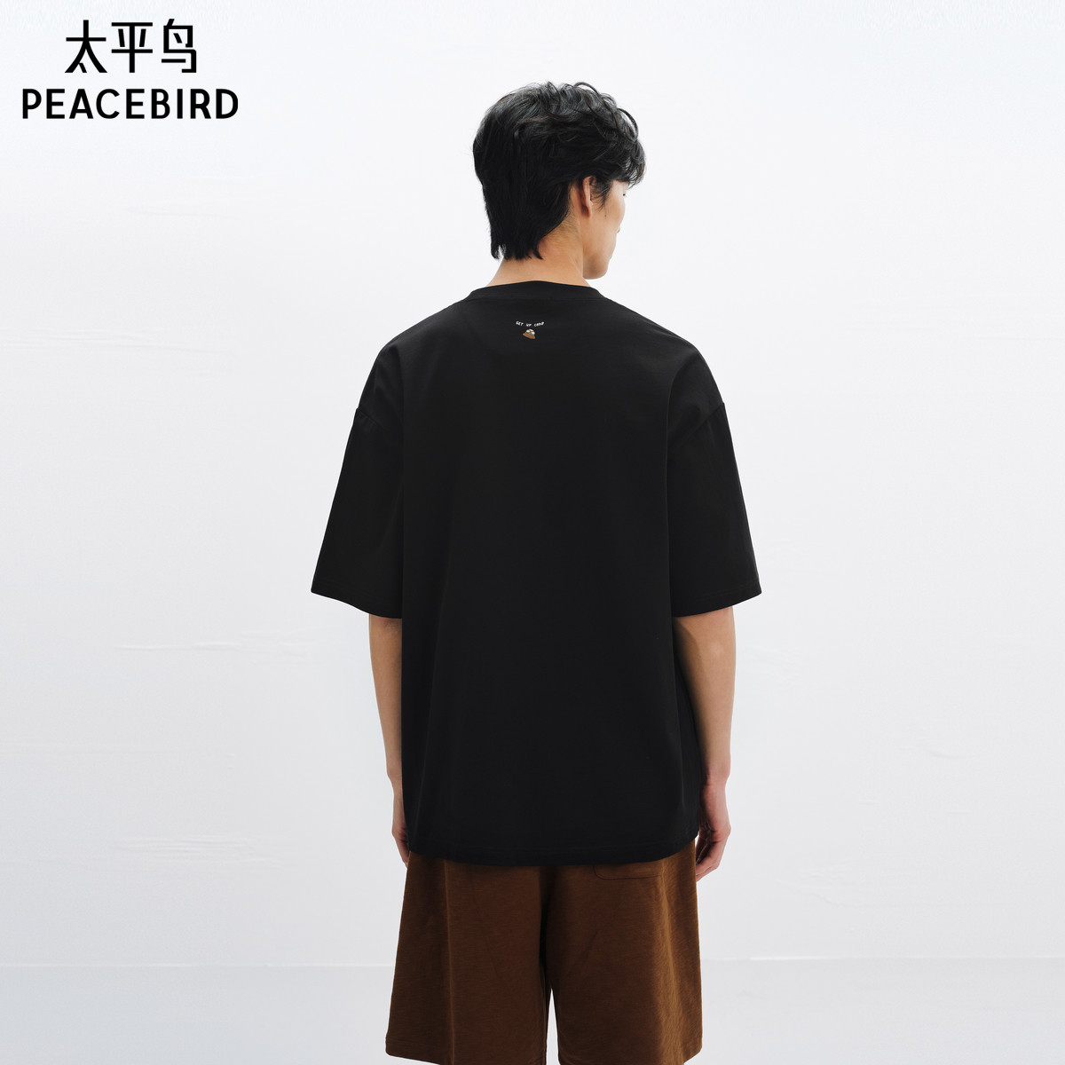 【晚心联名】太平鸟男装重磅短袖T恤25夏新款黑色刺绣体恤衫潮牌S