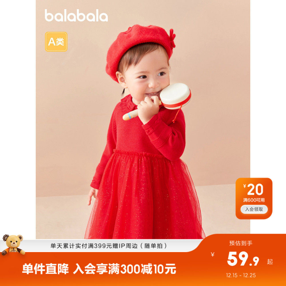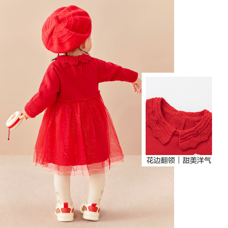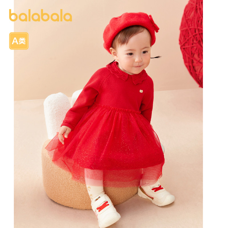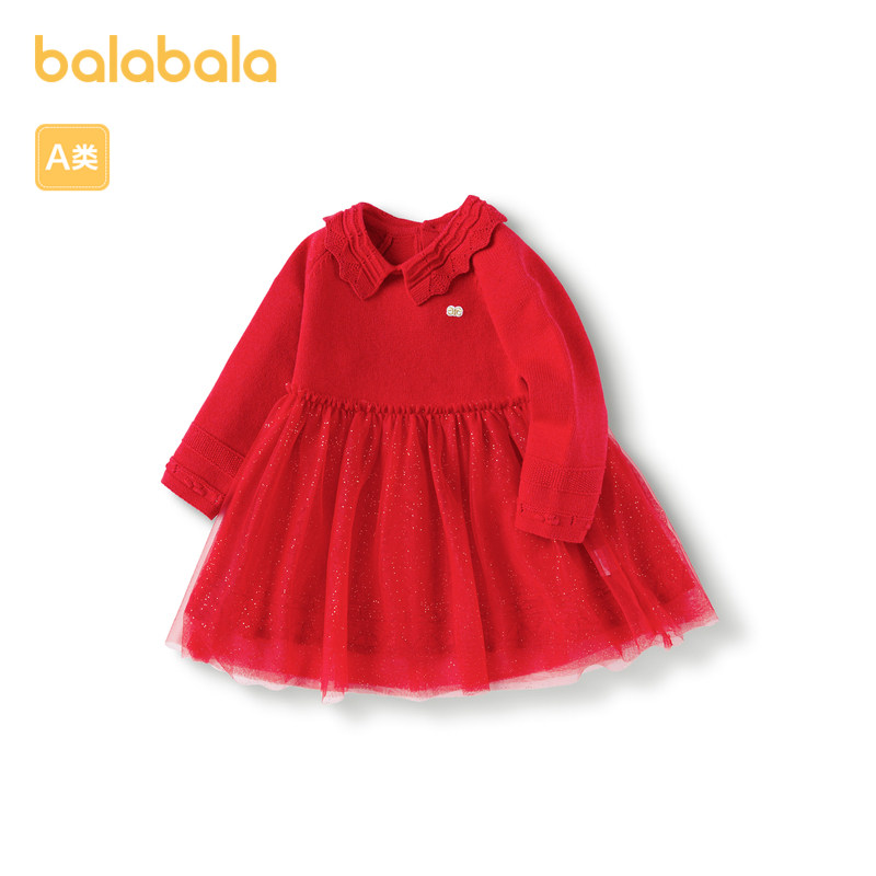 巴拉巴拉童装女童连衣裙宝宝小童公主裙蓬蓬纱裙满月喜庆红春秋装
