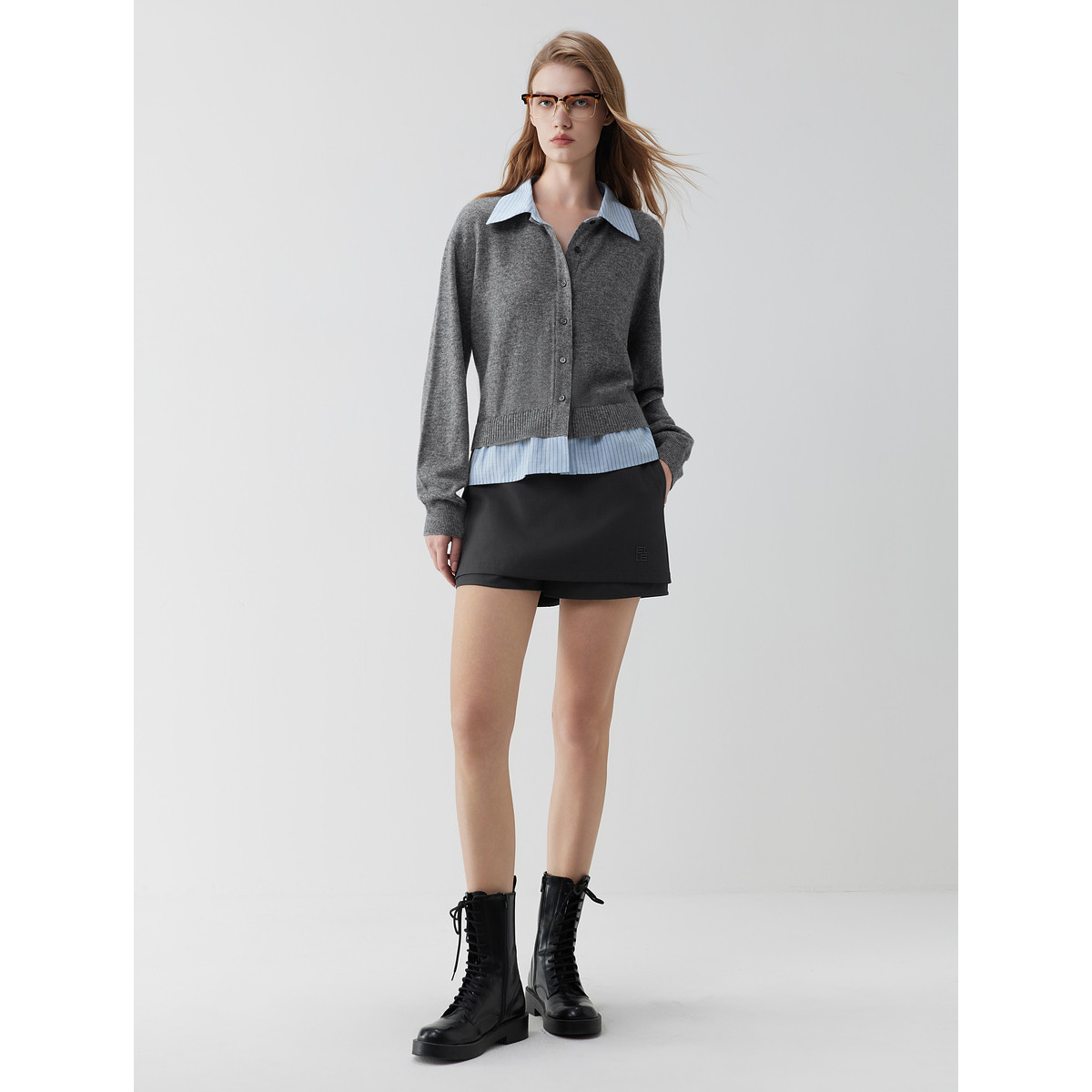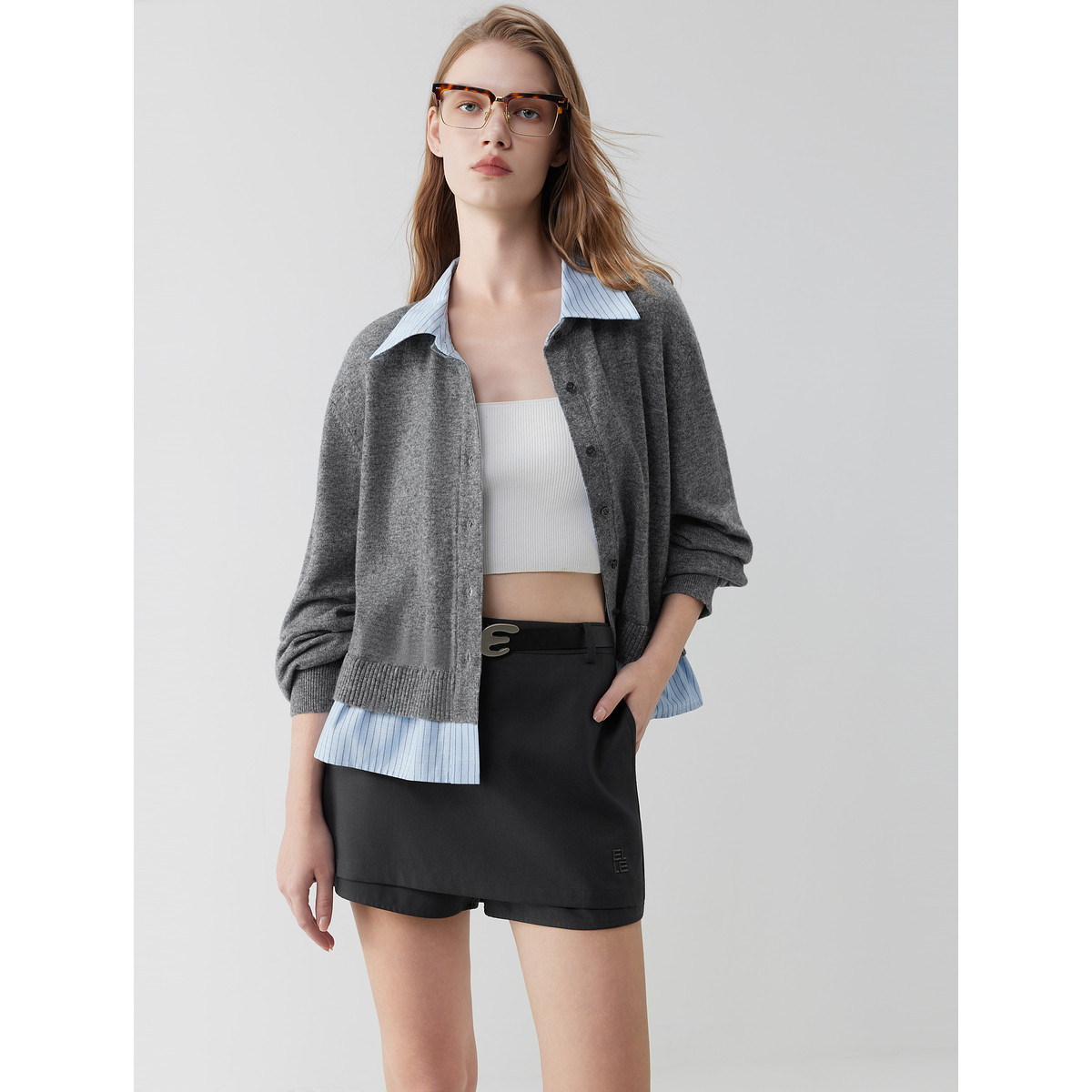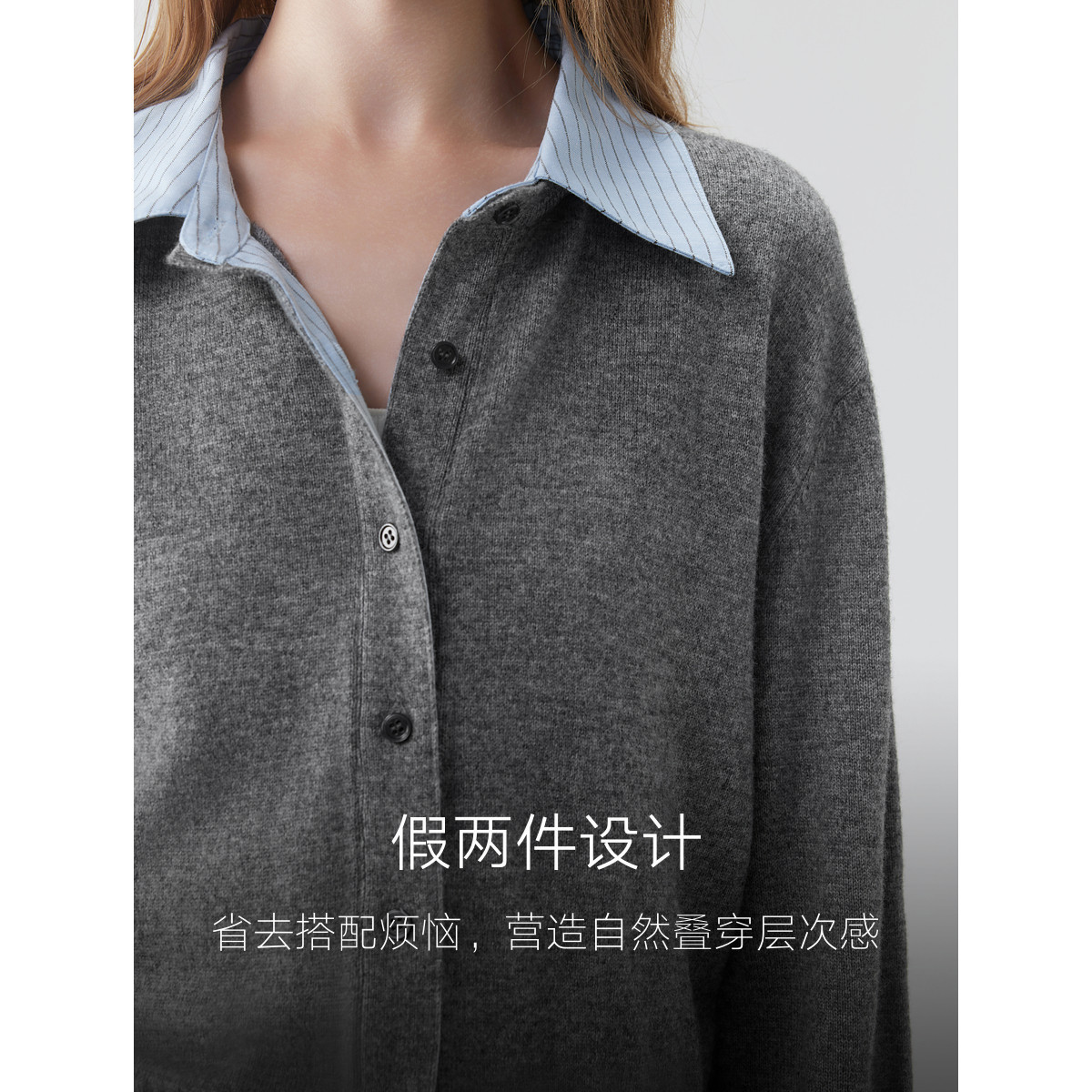 ELLE绵羊毛条纹拼接假两件针织开衫女2025秋季新款设计感休闲毛衣