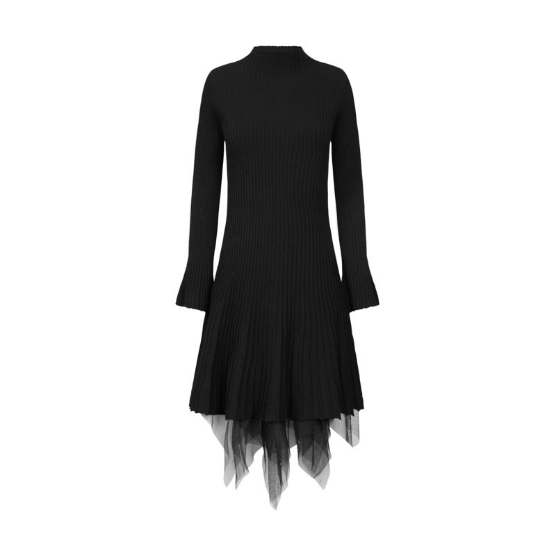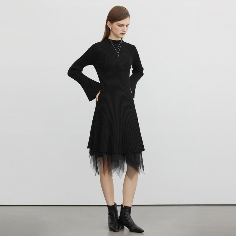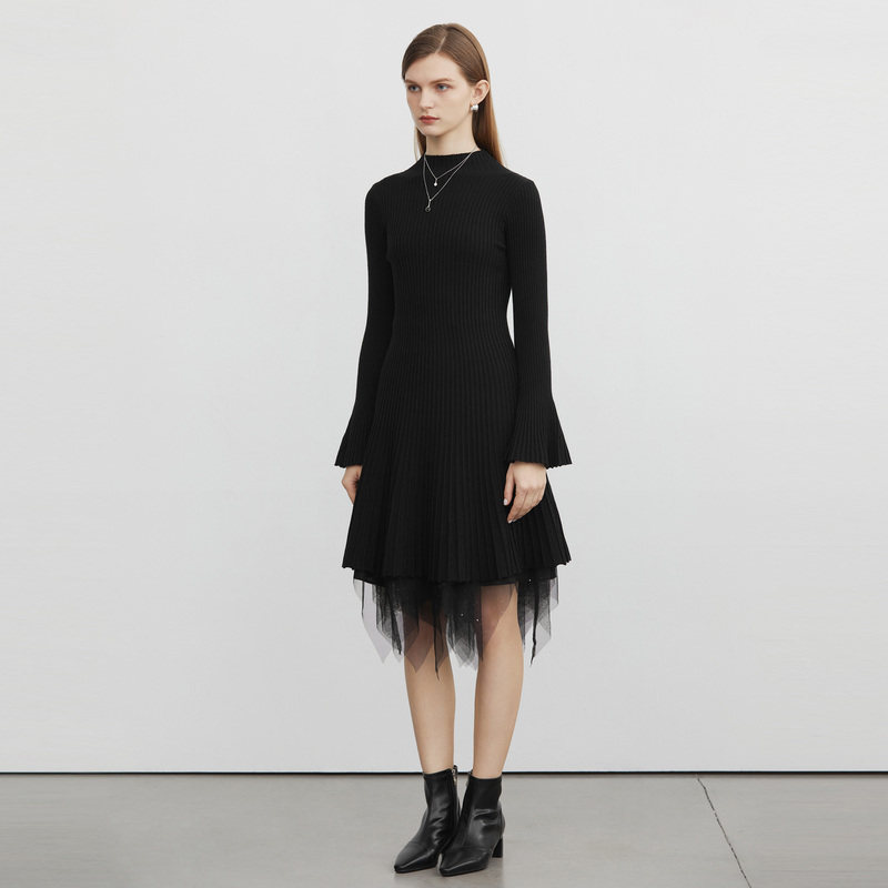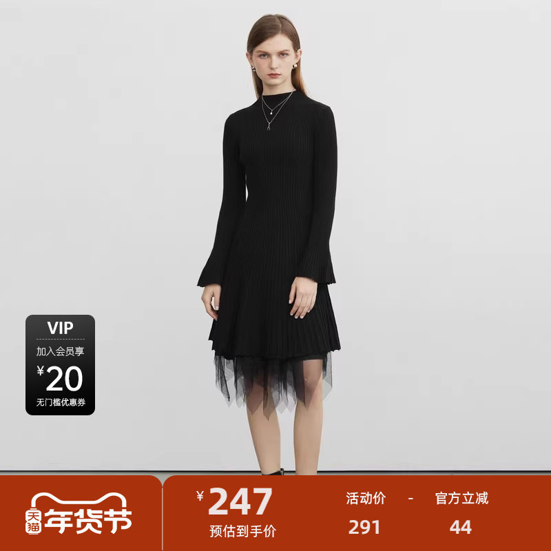 sdeer圣迪奥女装半高领网纱针织长袖连衣裙套装S224Z1233