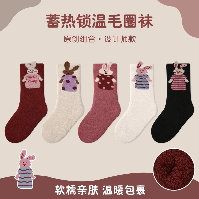 女童袜子秋冬款加绒袜儿童冬季加厚保暖毛圈袜宝宝卡通兔兔中筒袜