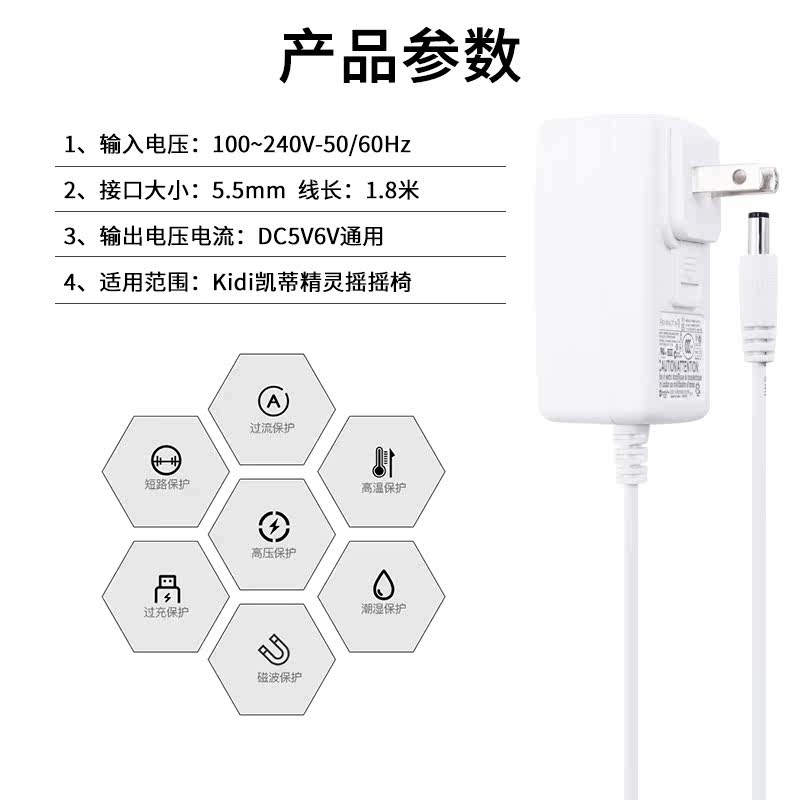Kidi Elite凯蒂精灵电动婴儿摇摇椅电源适配器摇篮床5V/6V通用原装充电器线1.8米