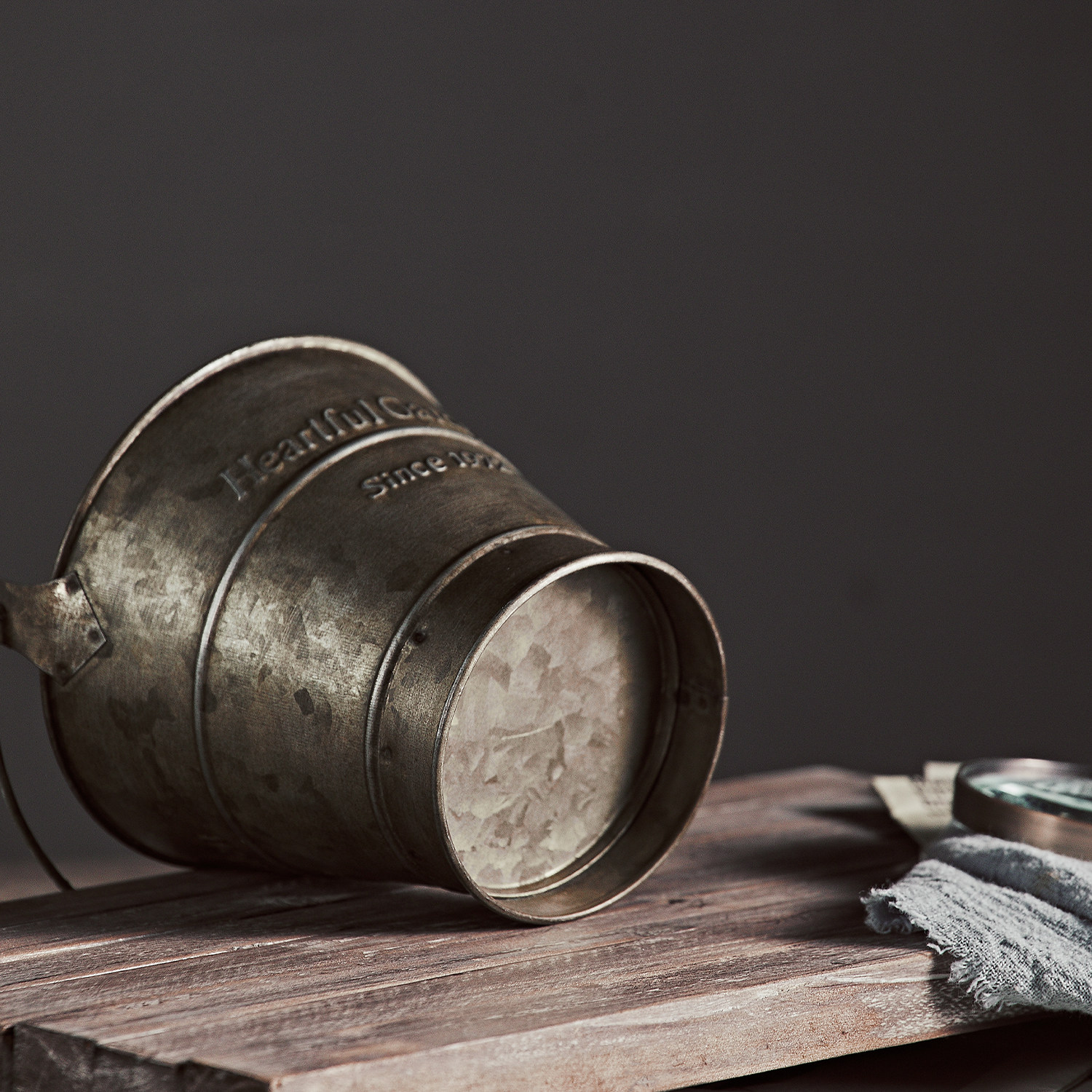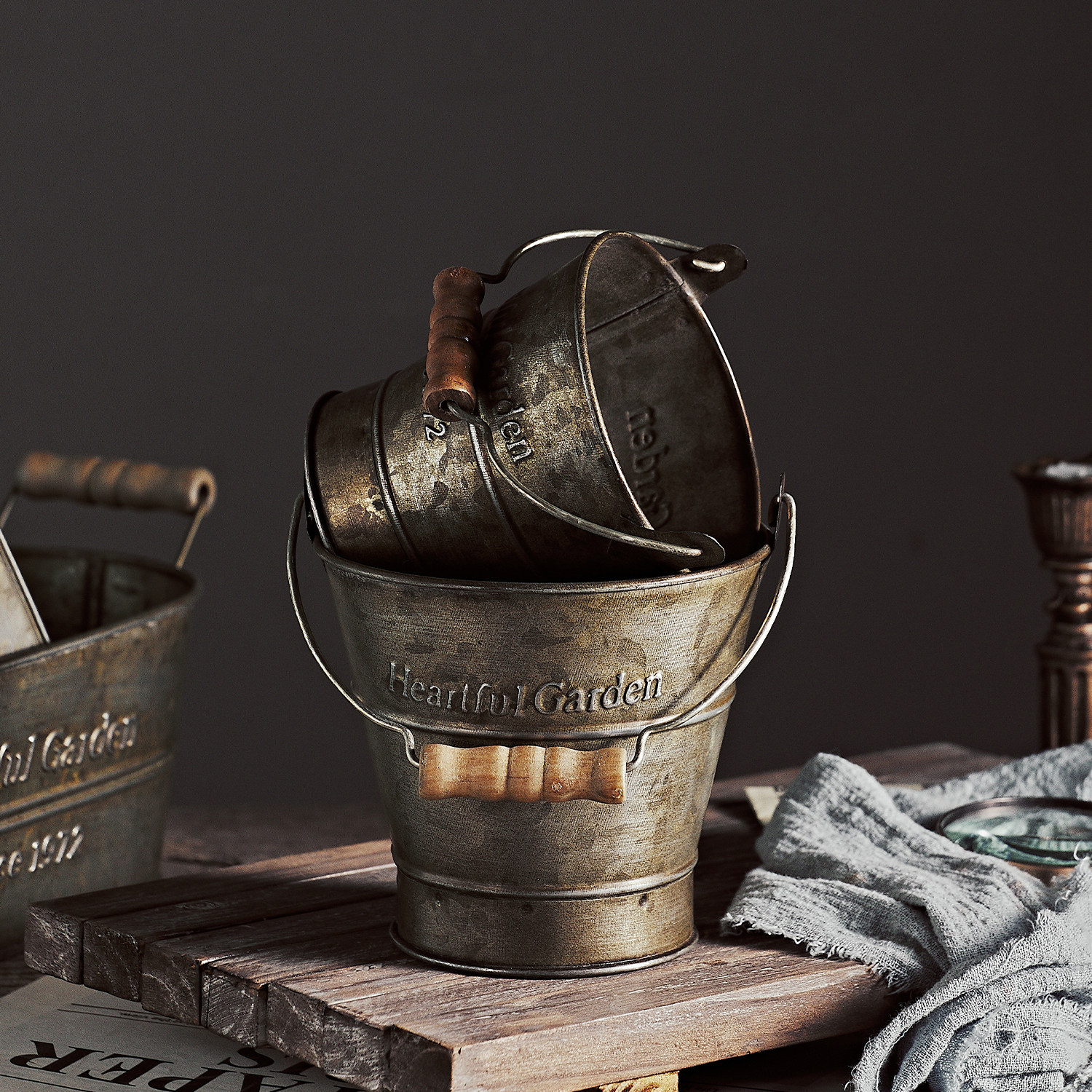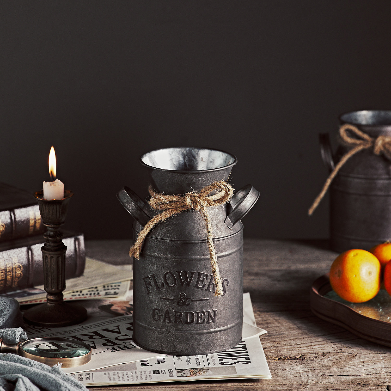风复古做旧欧式麻绳铁艺收圆桶铁皮提桶储物罐英文田园风摄影道具